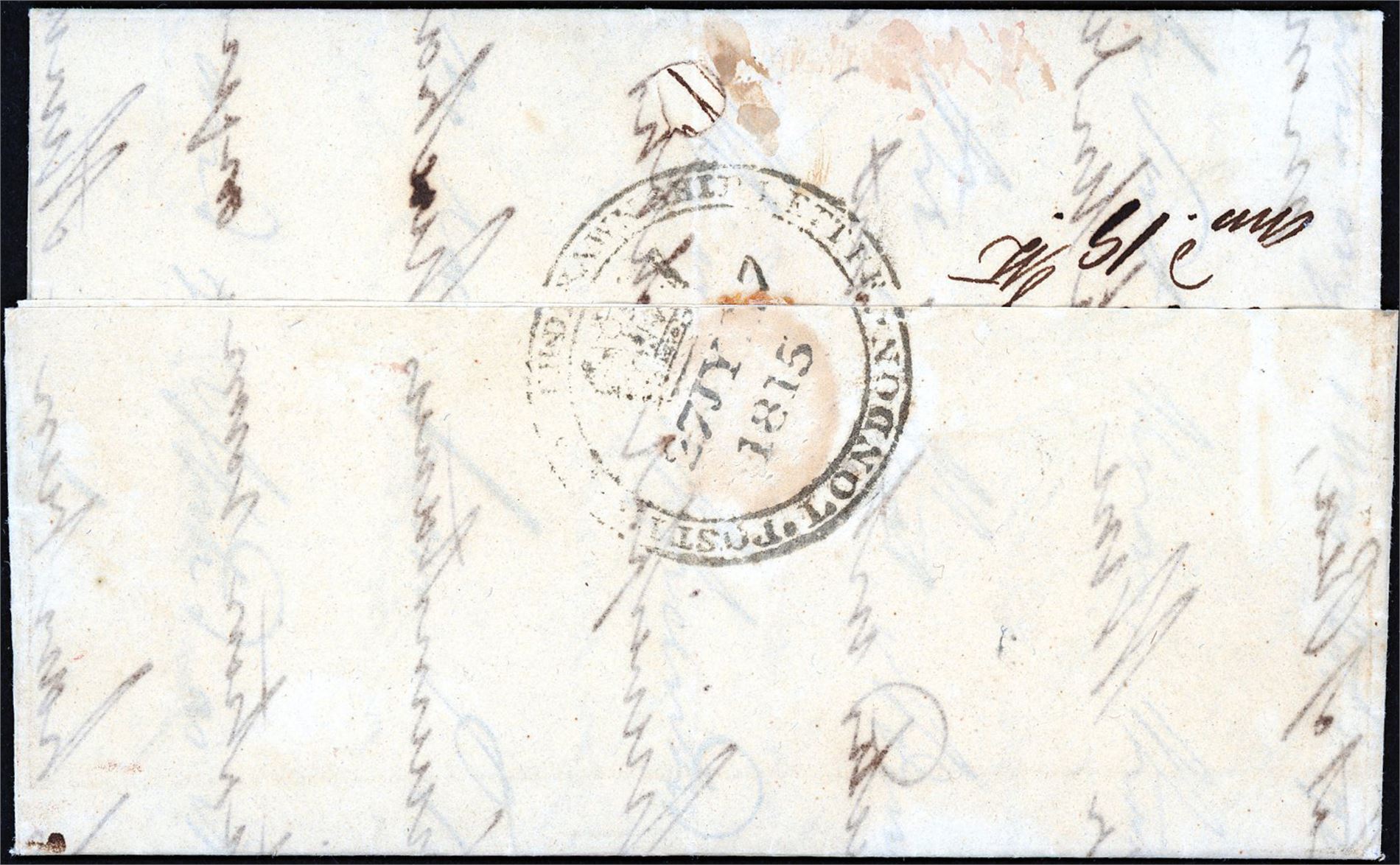 A complete letter from London 27th July 1815, and sent to Madeira. The letter is endorsed "pr. Alnwick Packets" in lover left corner and the rare postmark "Post Paid Withdrawn Ship letter 27Jy27 1815 London" at reverse. (5264634)