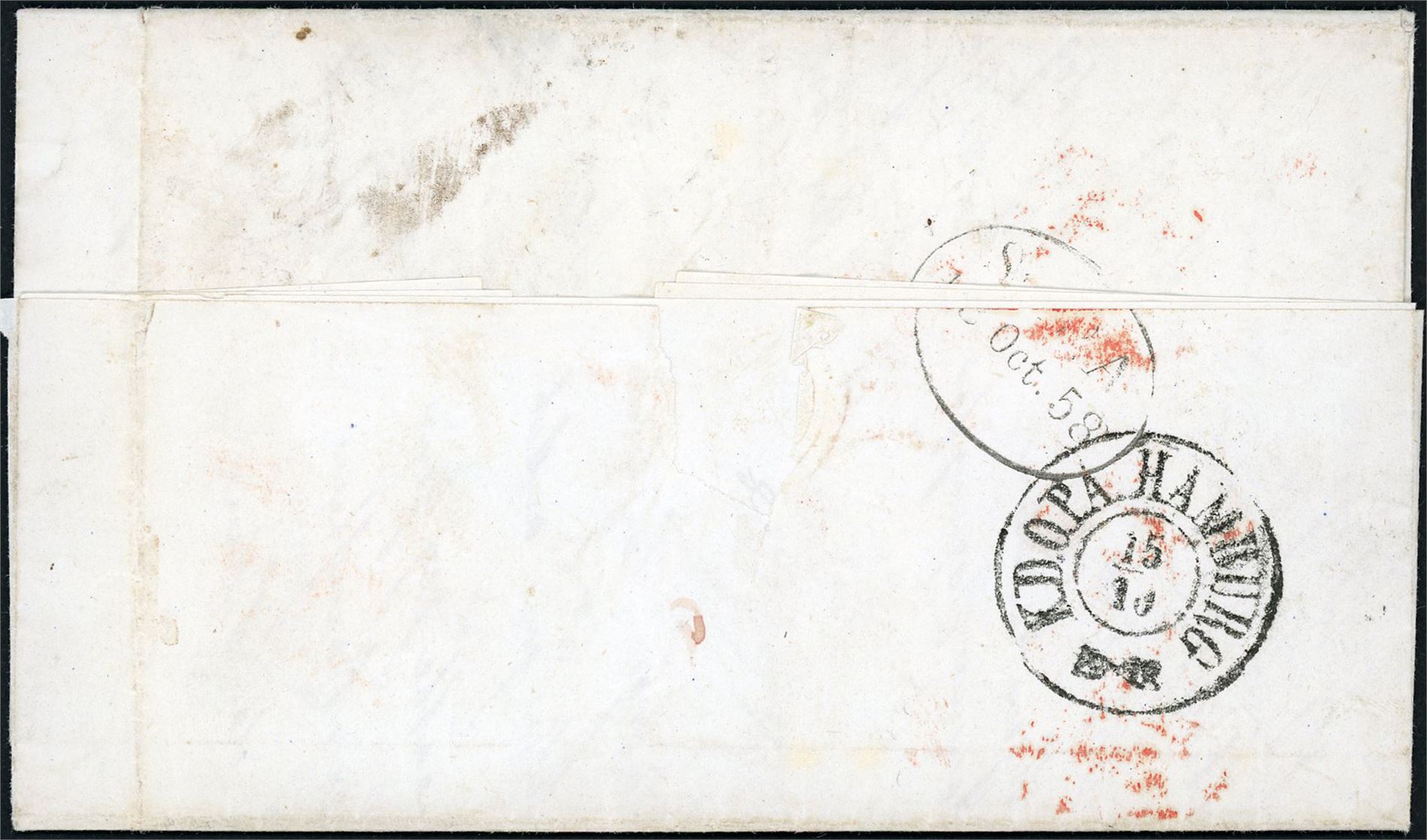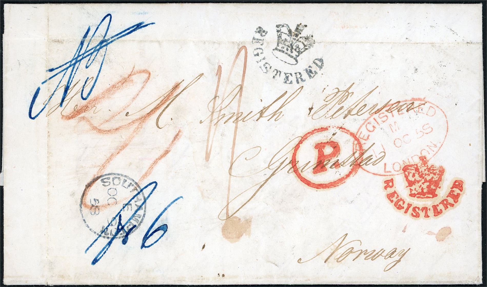 A complete letter, dated "Southhampton 9de October 1858 and sent as a registred letter via "London 11 Oc 58", "KDOPA Hamburg 15.10" to Grimstad, Norway.