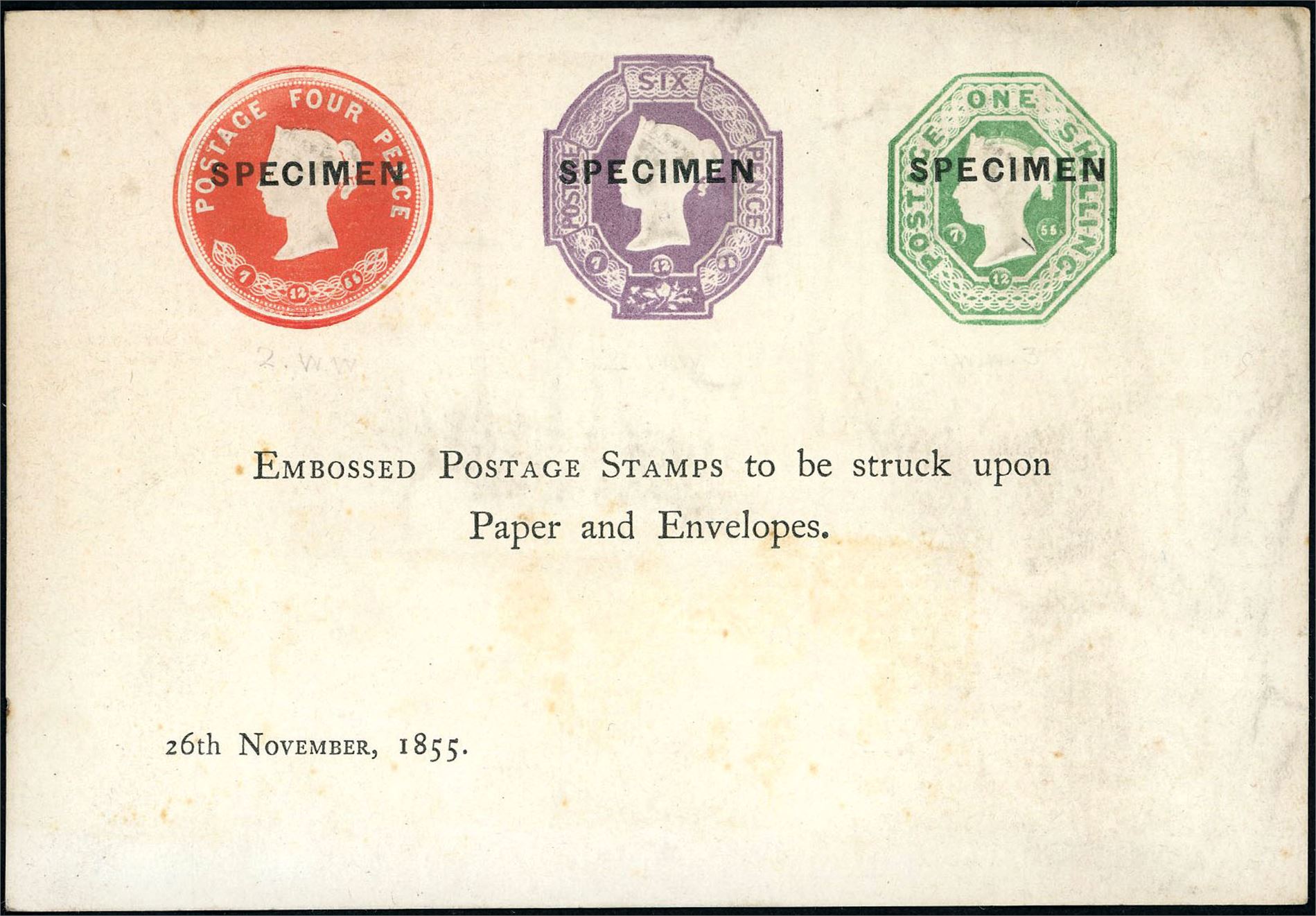 1855 (Nov 26): Postal Notice "Embossed Postage Stamps to be struck upon Paper and Envelopes" showing 4 d, vermilion (7.12.55), 6 d. mauve (7.12.55) and 1 s. green (7.12.55). In October 1855 the GPO offered to stamp items of Postal Stationer sent to Somerset House with embossed stamps; the initial Dies available were 1 d., 2 d., 4 d., 6 d. and 1 s. To make up different rate amounts the GPO offered composite printings or "Compound Stamping". A fine example of this scarce Notice.