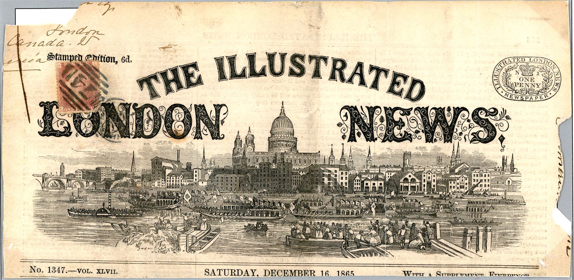 The upper part of a decorative newspaper from December 16, 1865 with a 1d red cancelled "74" and sent to Canada.