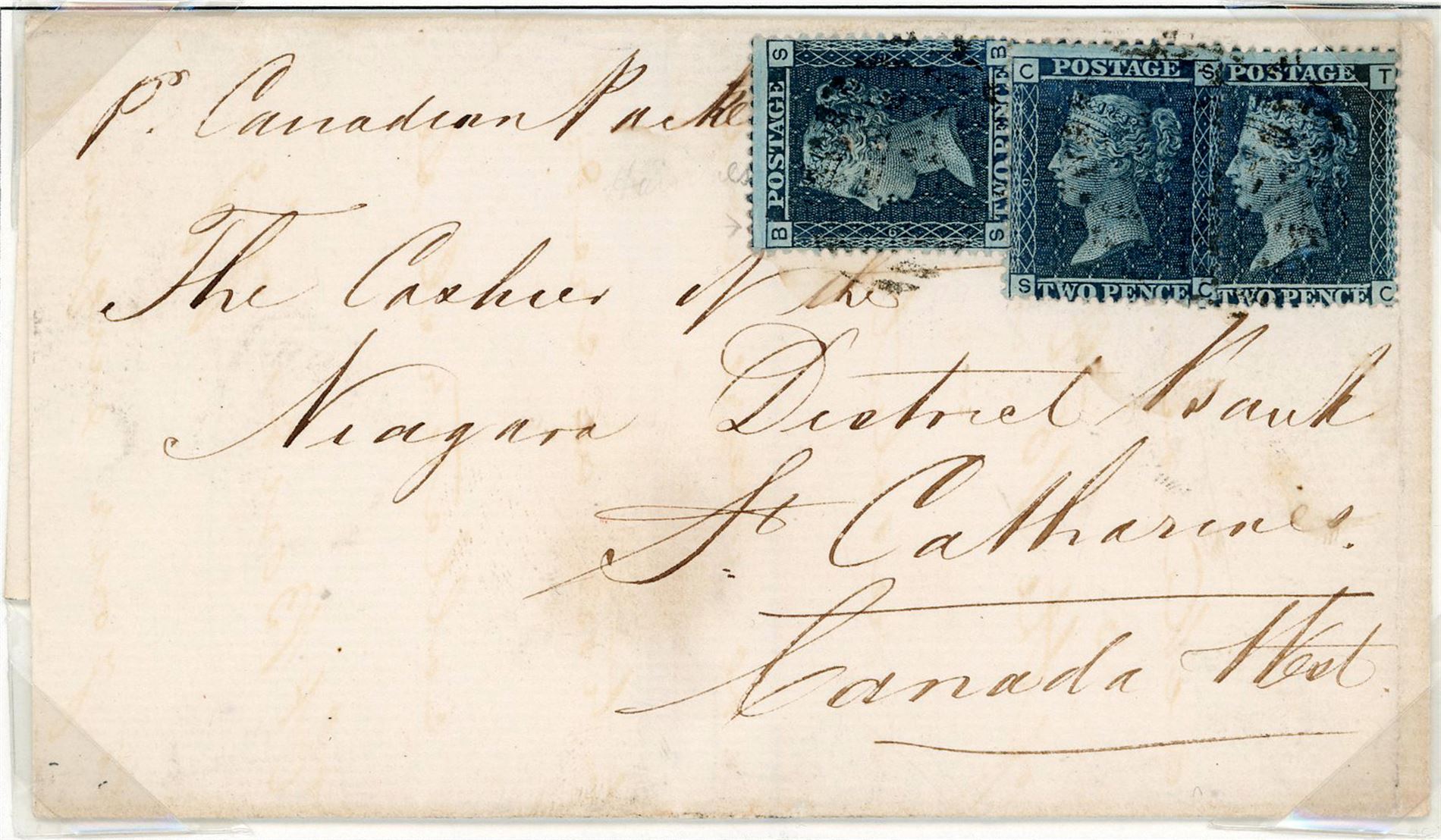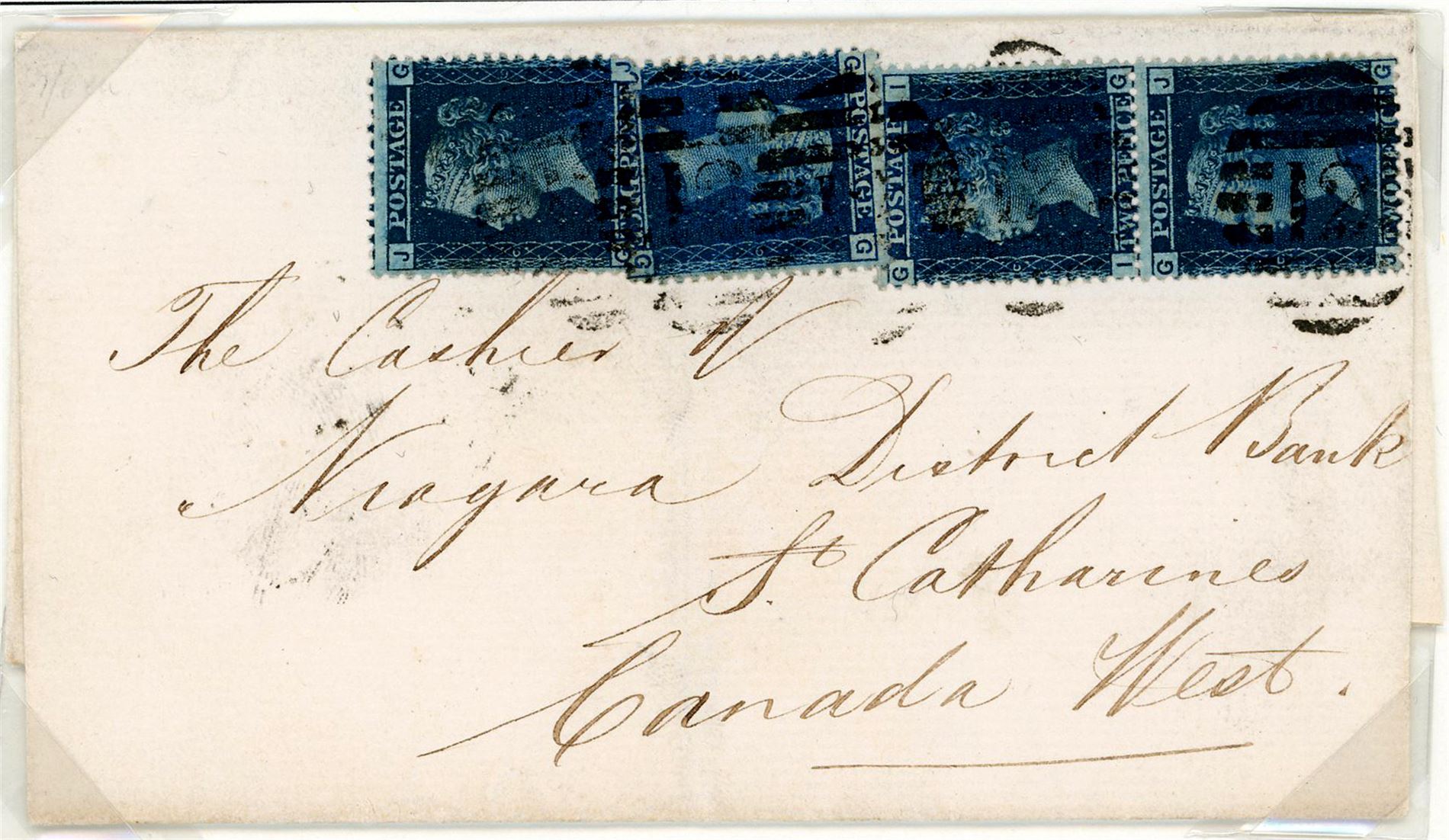 45. GB. Two letters, both sent from "St. Catharines UC" to Canada in 1863. One franked with four 2d blue, and one franked with three 2d. Nice quality.