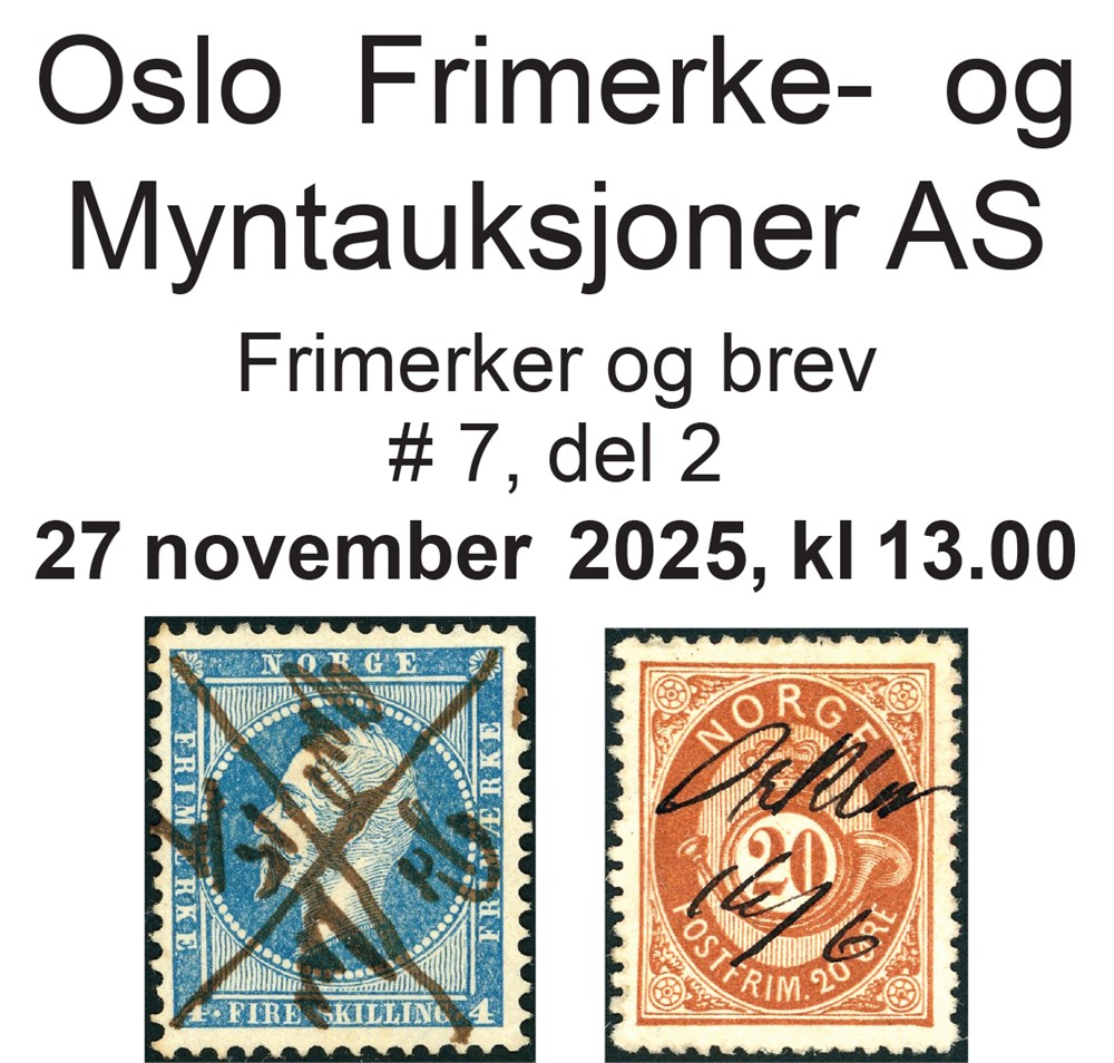 At the hammer price there will be a 20% commission plus any postage and Nkr 100 in bank-charge. If it is desired to submit objects for certification, this must be agreed within the first three days of the auction. Payment is made as an advance or upon collection of the objects.