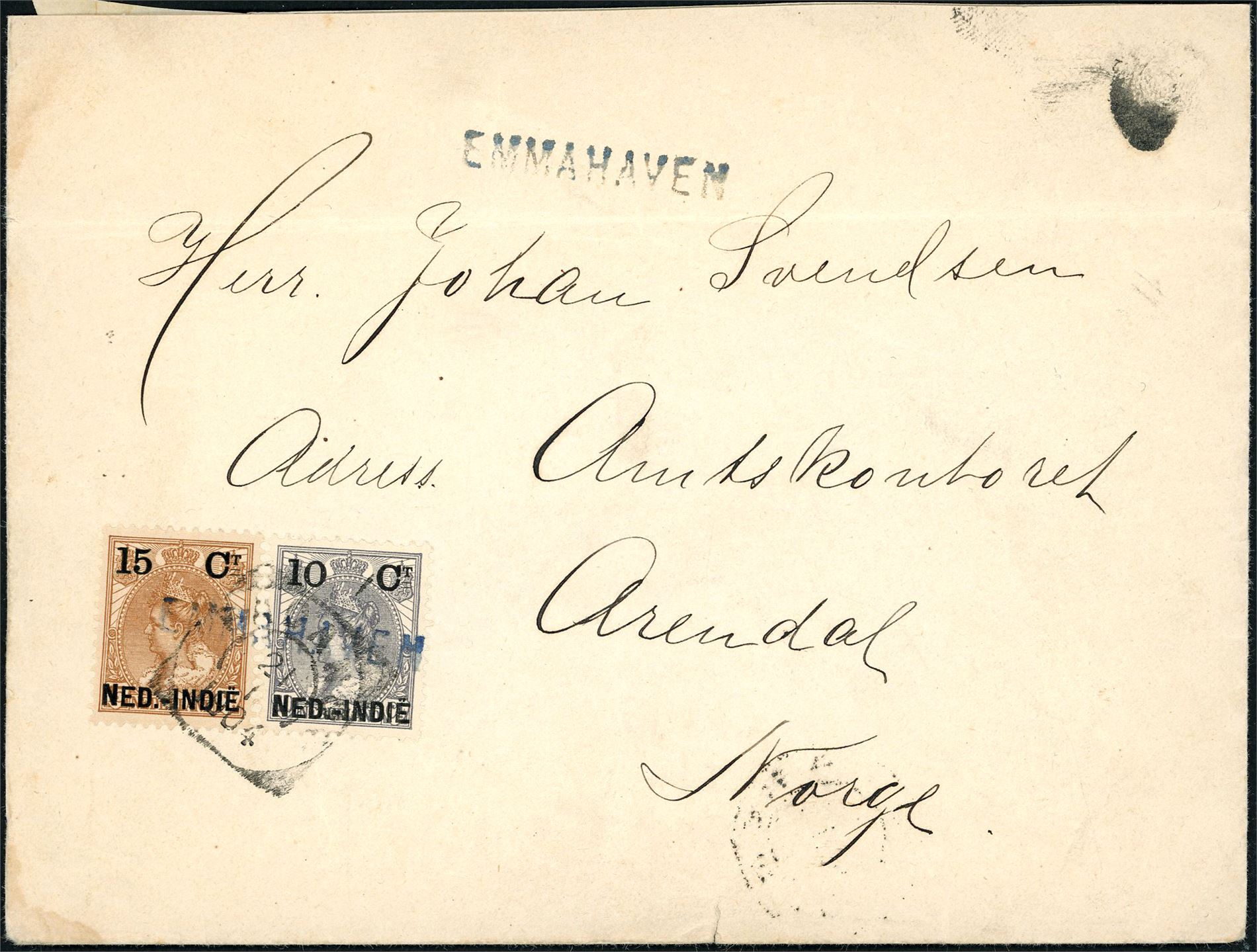 Netherland India. One 10 c and one 15 c on envelope to Arendal, Norway, cancelled very light "21.1.1904" together with a line (private?) postmark "Emmahaven". Arrival cds at reverse.