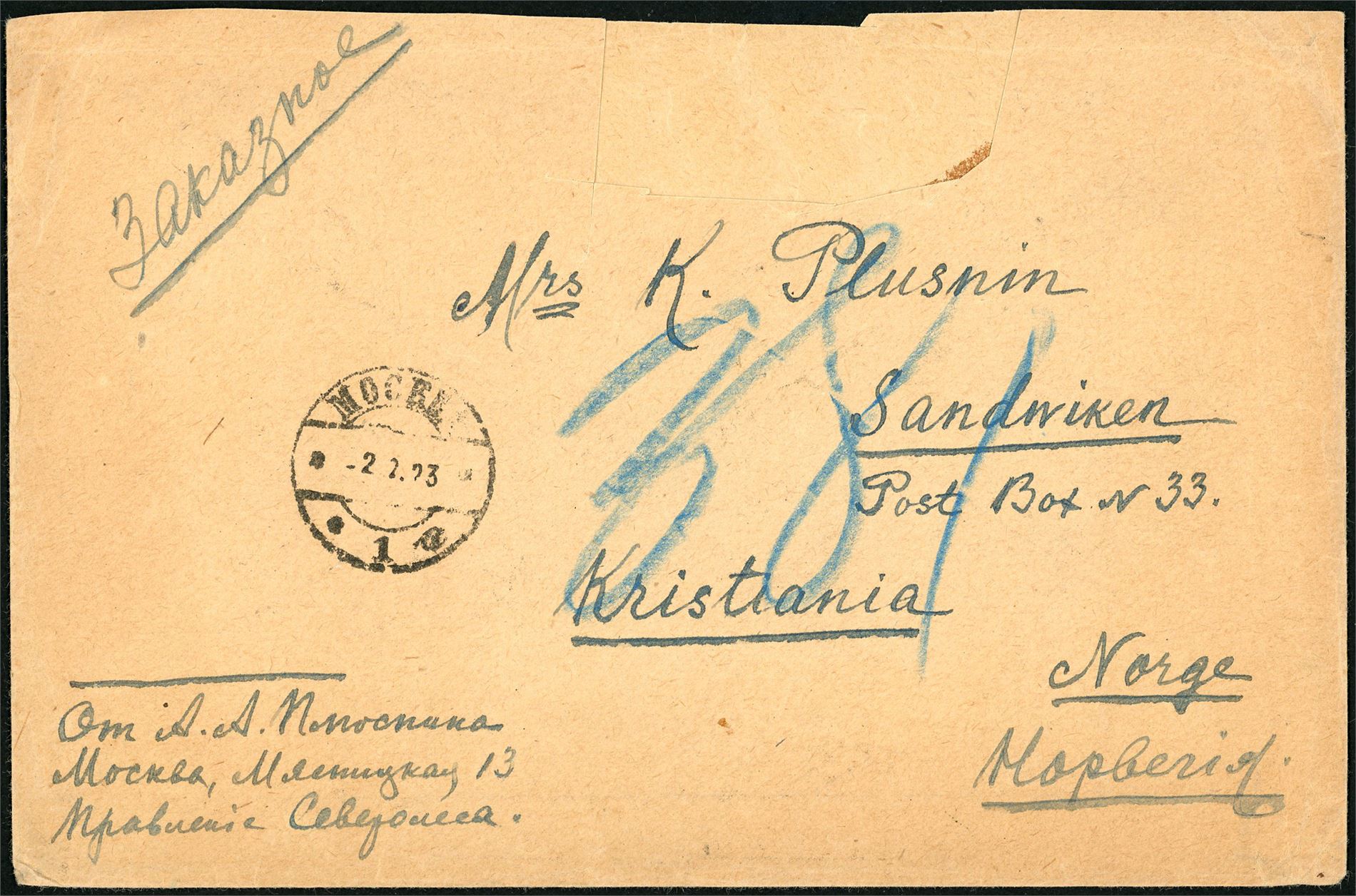 Russia. 10,50 Rubels postage to Norway. Envelope franked with 12 unperf. stamps, cancelled "Moskow 2.2.1823" and sent as registered letter to Kristiania.