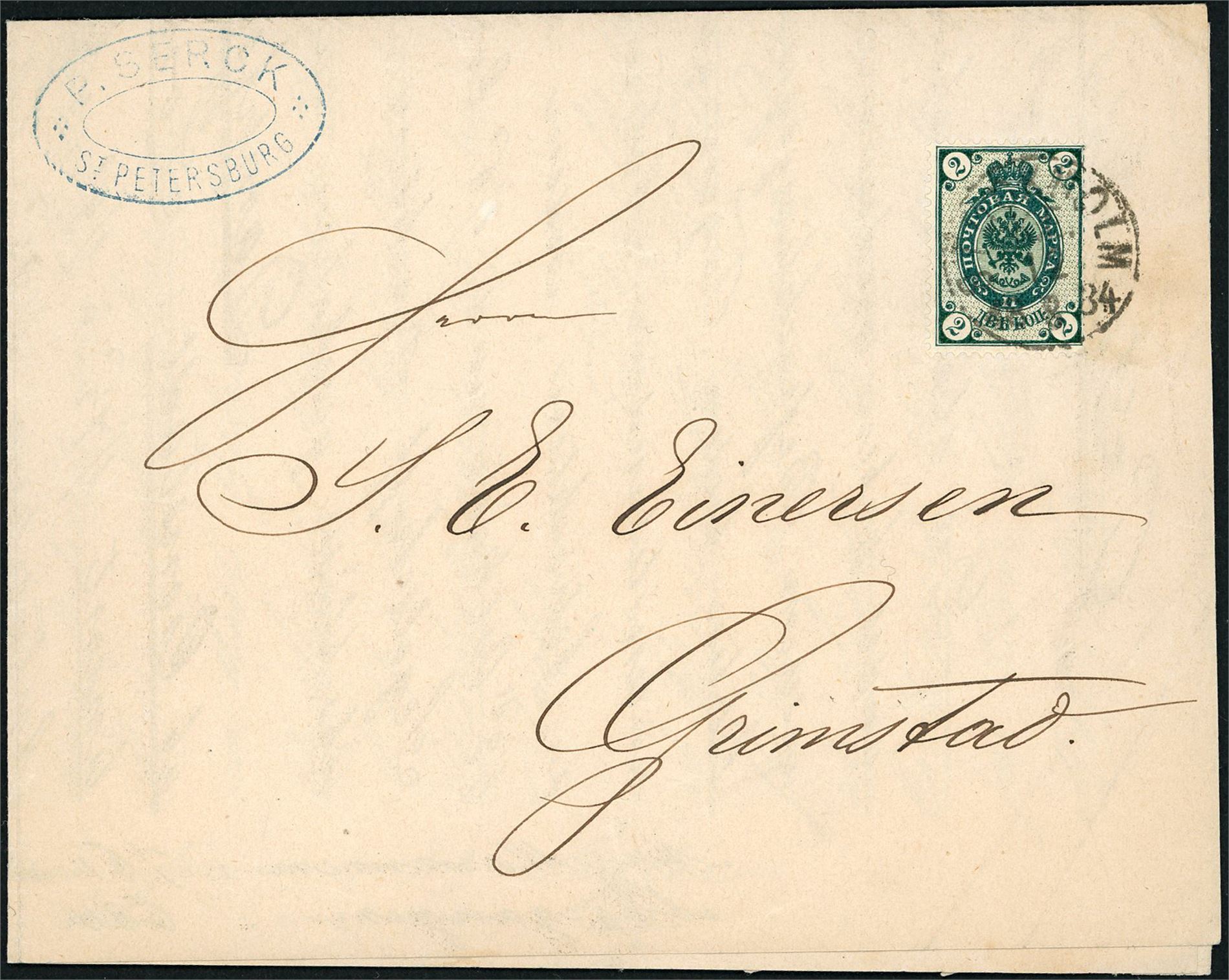 30 Aa. Russia. 2 Kop on complete printed matter from St. Petersburg, cancelled "Stockholm 12.8.1884" and sent to Grimstad, Norway.