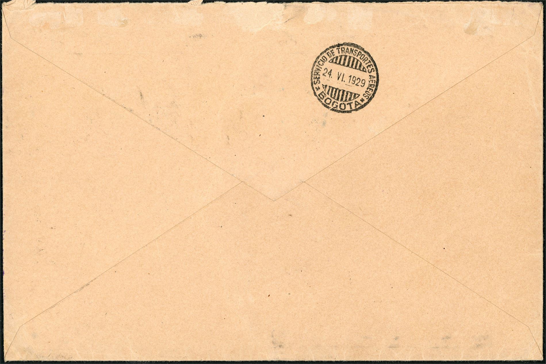 SCADTA LA 678,Columbia 298. Envelope from the company Finnshyttan, Sweden franked with two 30 c SCADTA with overprint "SU" (Sweden) together with two 4 c Colombia 1926, cancelled "Serwicio de Transportes Aereos Barranquilla 21.6.19 29" and sent as Airmail to Bogota, Colombia. "Servicio Transportes Aereos Bogota 24.6.1929" cds at reverse. (5271006)
