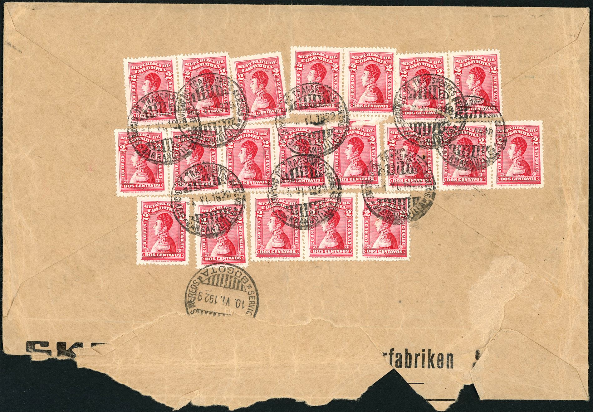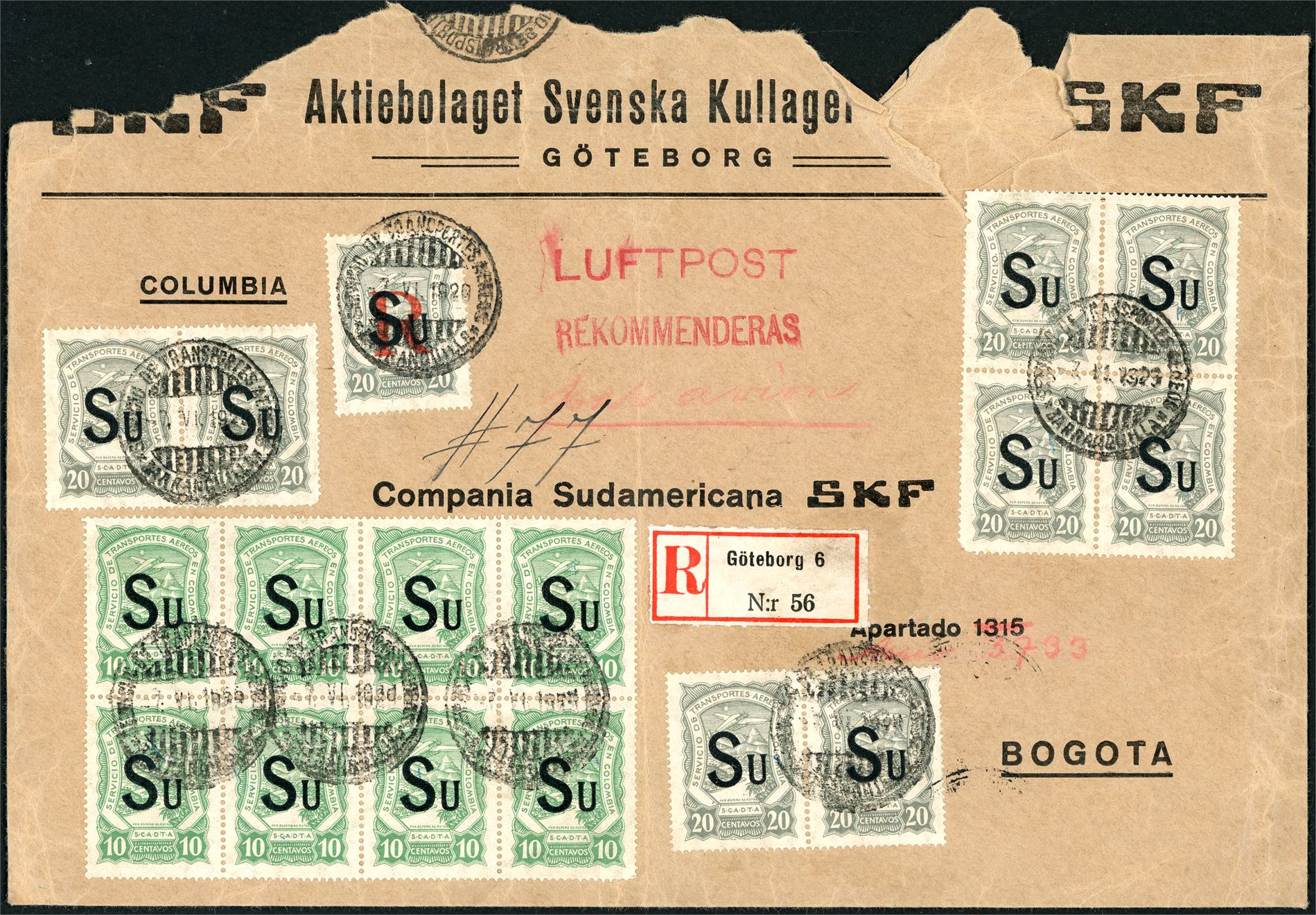 SCADTA LA 675,LA 677,Columbia 241. A somewhat broken envelope from the Swedish company "Aktiobolaget Svenska Kullager SKF" (A world leading company making Ball Bearing) franked with eight 10 c- and six 20 c SCADTA with overprint "SU" (Sweden), one 20 c with both overprint "R" in red and "SU", together with twenty 2 c Colombia 1917 (all the 2 c are on reverse), cancelled "Serwicio de Transportes Aereos Barranquilla 7.6.1929" and sent as as recommende mail with Airmail to Bogota, Colombia. "Servicio Transportes Aereos Bogota 10.6.1929" cds at reverse. One 20 c SCADTA with minor fault.