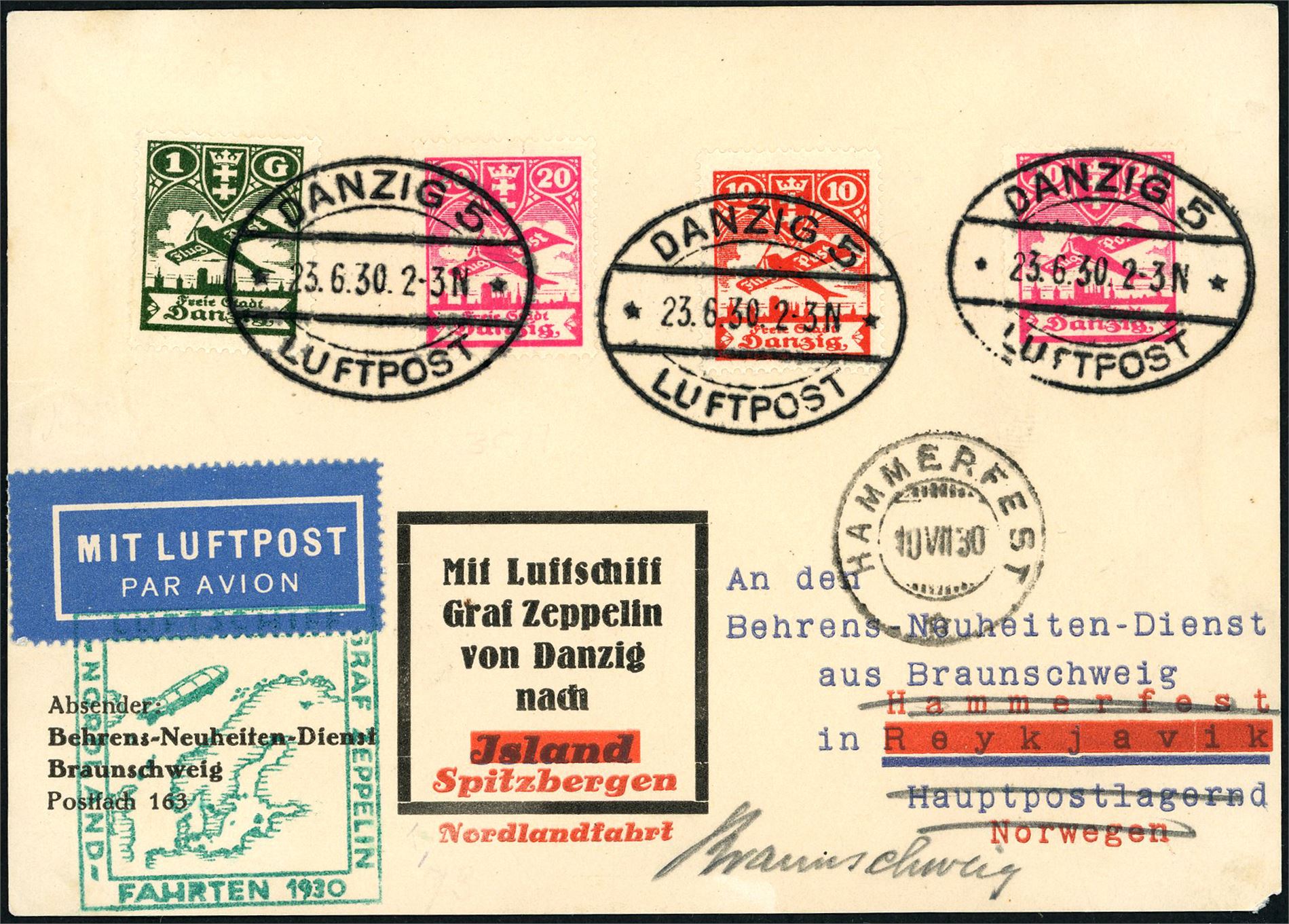Danzig. Four stamps on card, cancelled "Danzig 5 Luftpost 23.6.30" and sent with "Graf Zeppelin Nordland-Fahrten 1930". "Hammerfest 10.7.30" cds at side. The card printed "mit Luftschiff Graf Zeppelin von Danzig nach Island Spitzbergen Nordlandsfahrt".