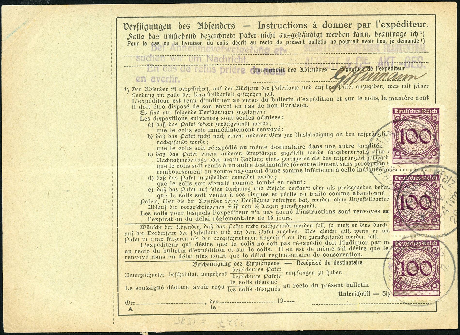 343,344,363. German packetsletter franked with total 7 Mk 85pf, cancelled "Frankenhal 23 Nov 26" and sent with Air Mail to Oslo. A vertical crease, but still decorative. (5272346)
