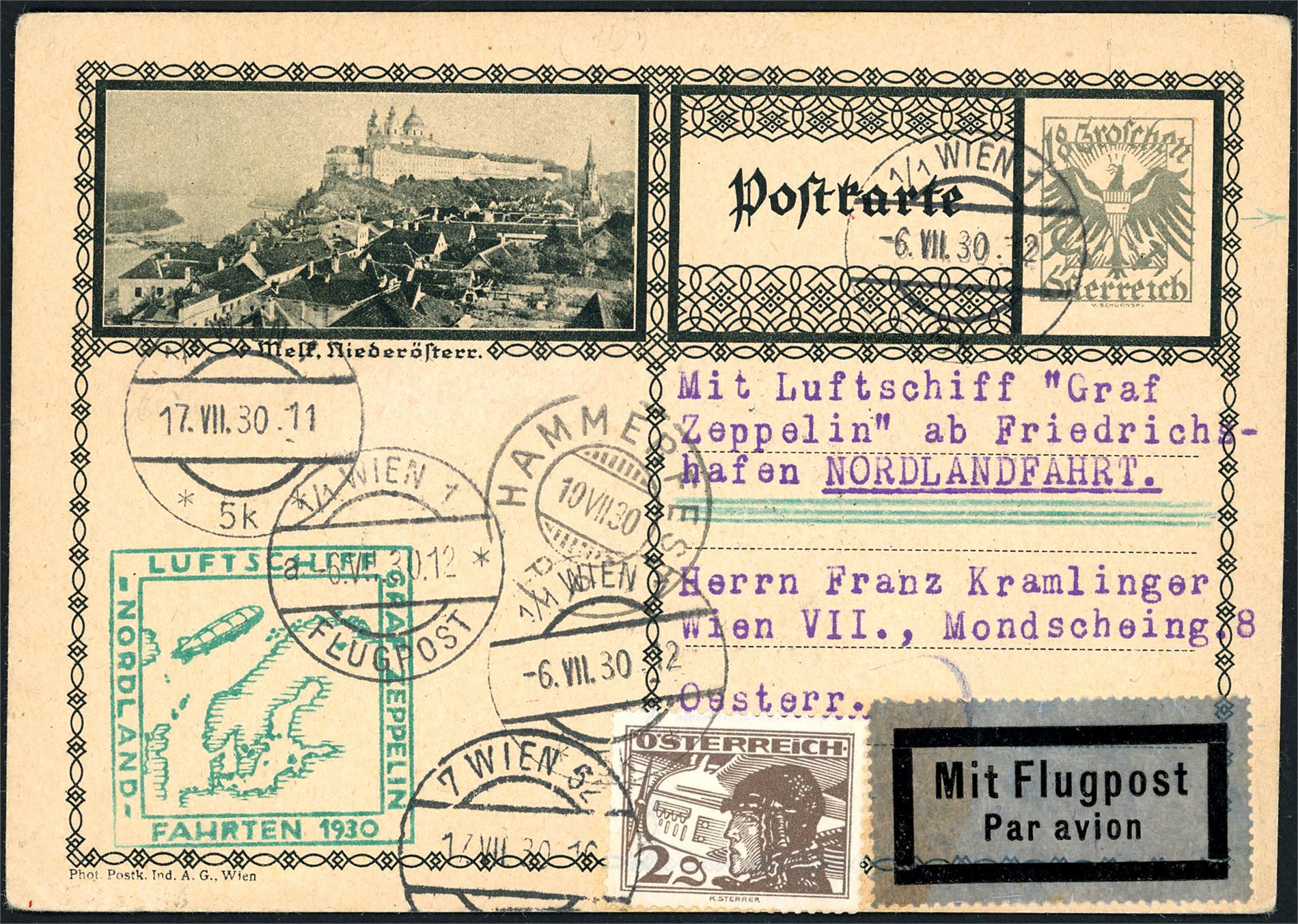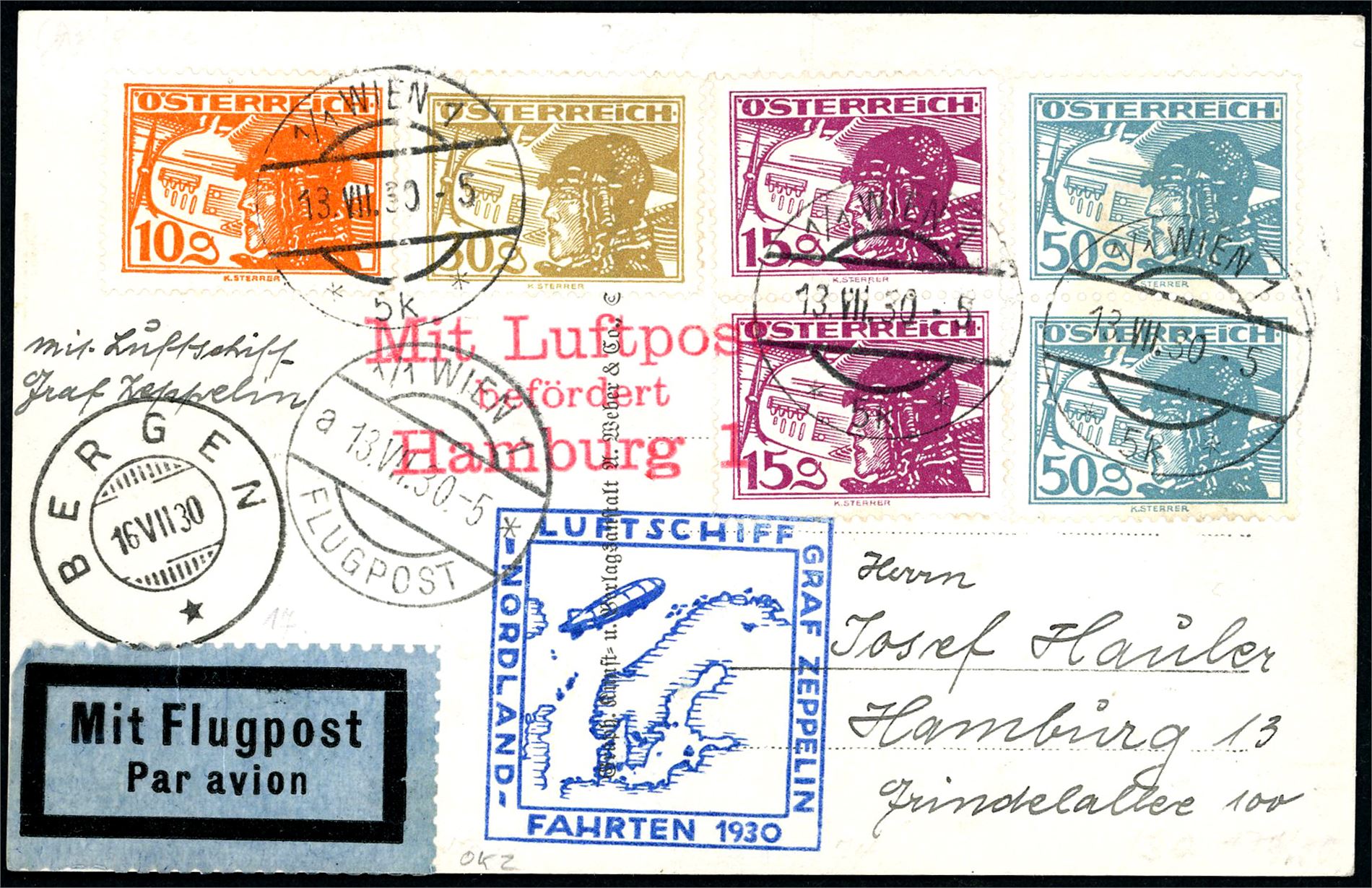 Austria. Two Zeppelin-cards, both sent with Graf Zeppelin on the "Nordland-Fahrten 1930". One with norwegian "Bergen16.7.30" cds and one with "Hammerfest 10.7.30".