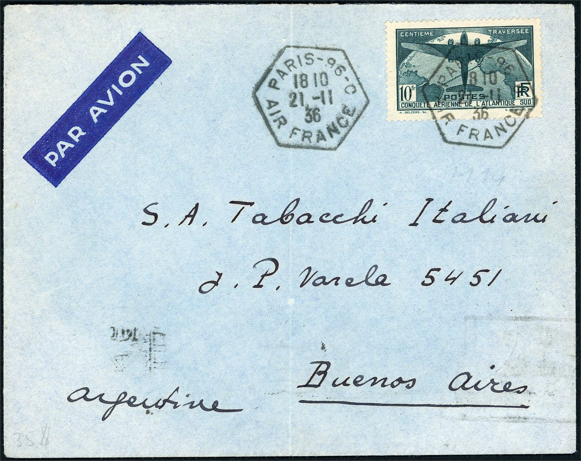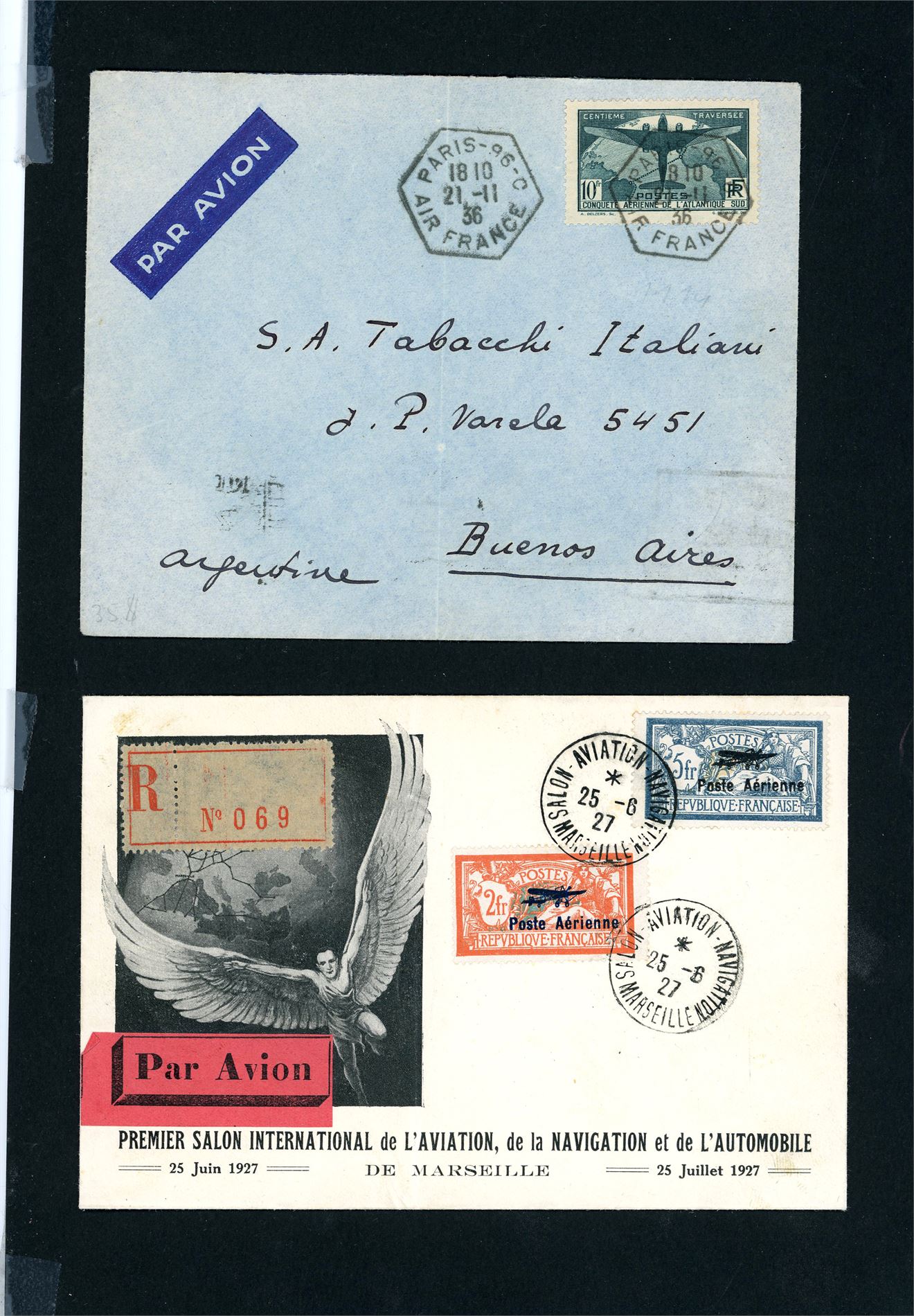 220/21,327. France. 2 Fr- and 5 Fr Poste Arienne on FDC, cancelled "Salon-Aviation-navigation marseille 25.6.27". (€ 400). Also one 10F on envelope to Buenos Aires, cancelled "Paris-96-C Air France 21.11.36".