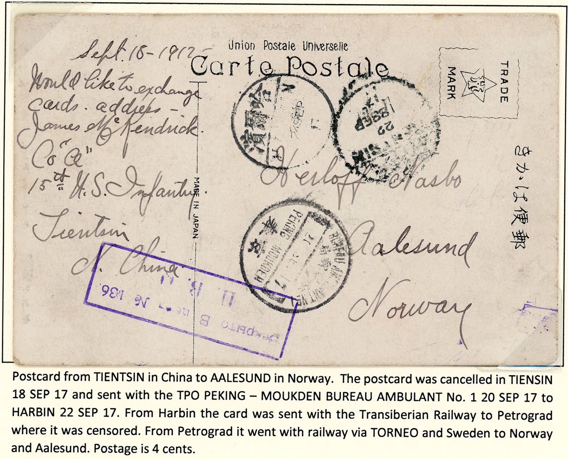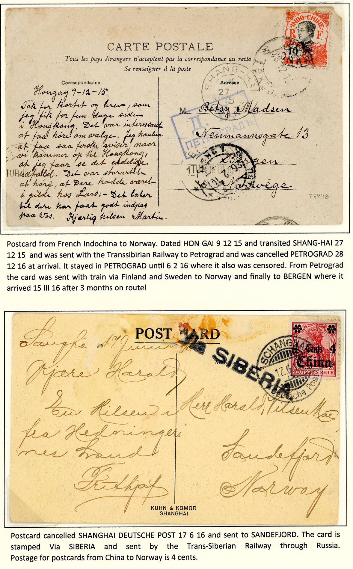 Tre kort sendt til Norge 1915/17: Et ufrankert fra Tientsin Kina, et fra Tysk Postkontor i Shanghai og et fra Indo-Kina.