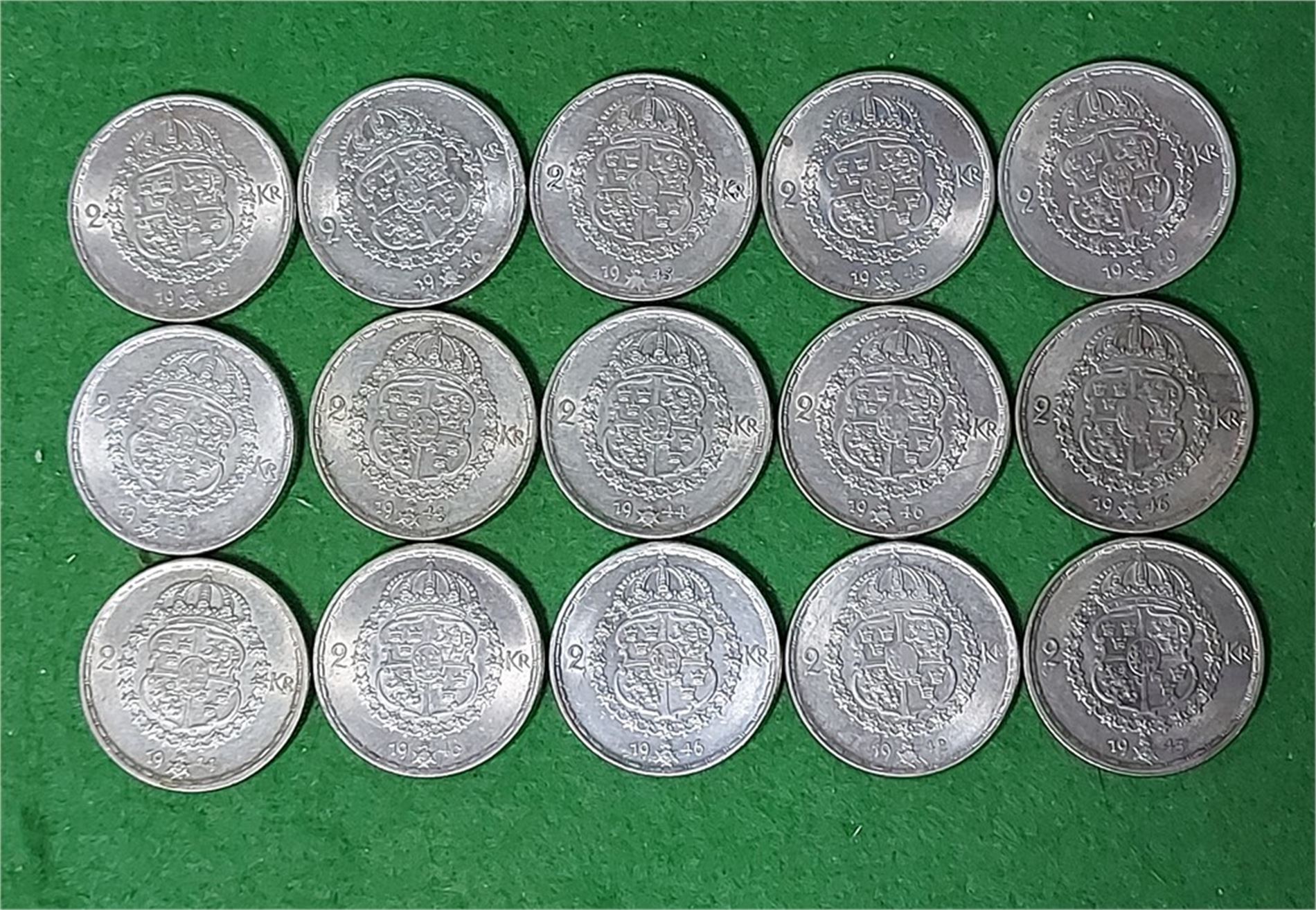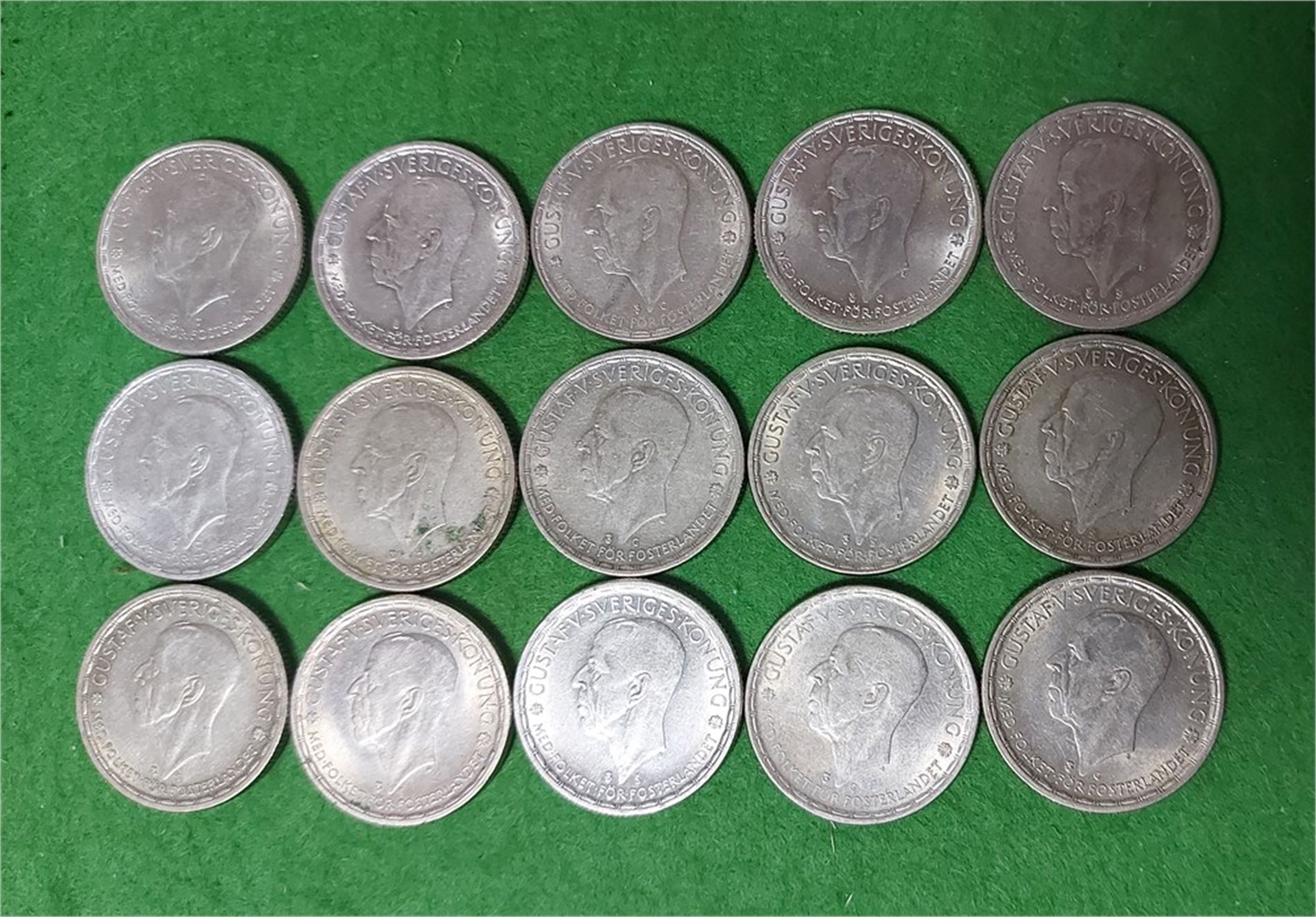 SVERIGE GUSTAF V parti 15 st 2kr 15gr/st, 0.400 silver, tot. ren silver 90 gr