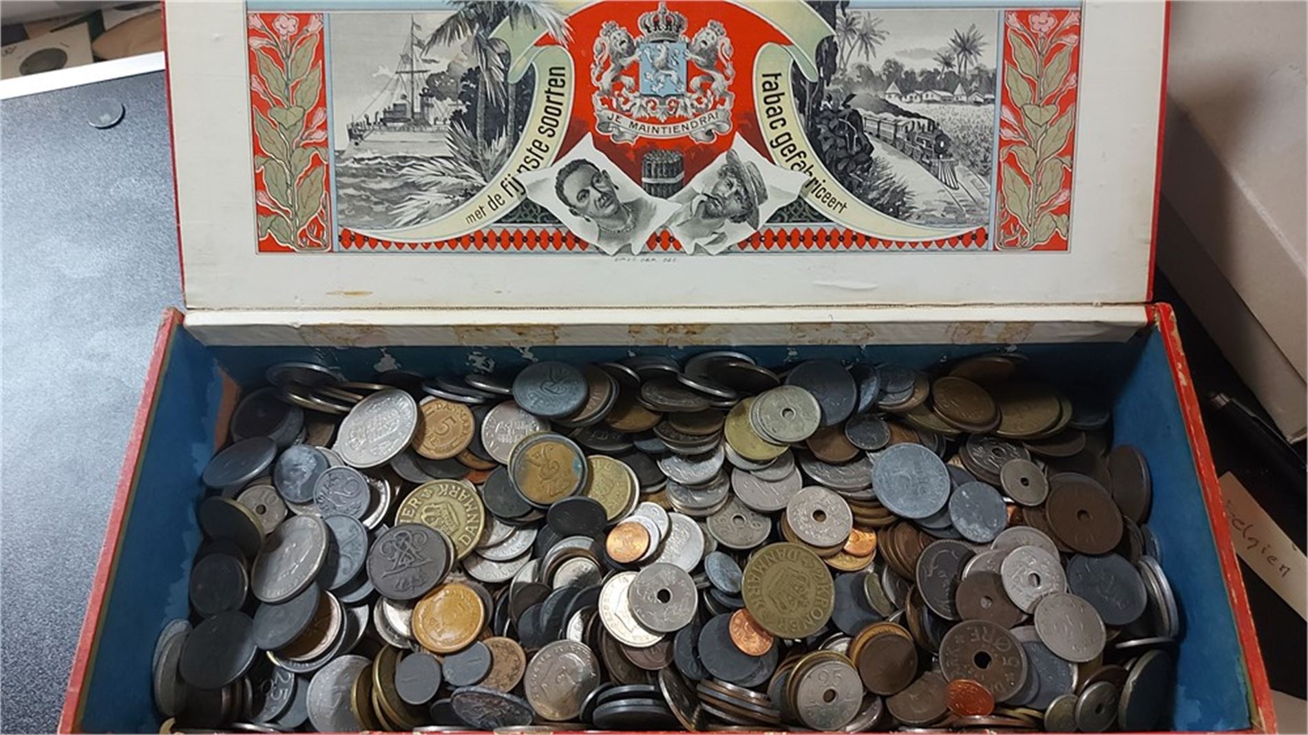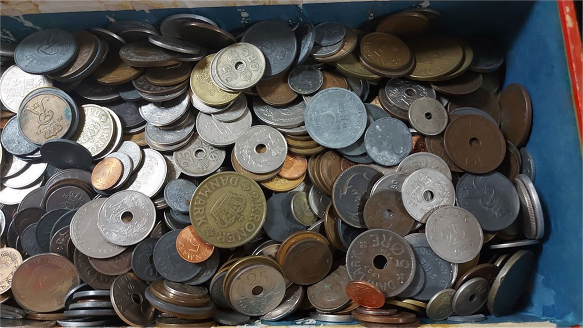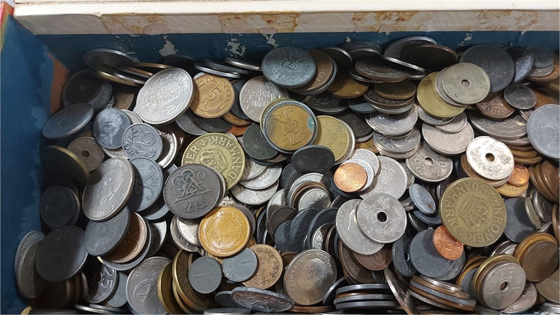Blandat parti danska mynt i cigarrask, total vikt cirka 4,5 kg. Innehåller både nyare och äldre kopparmynt. Ej genomgånget av oss.