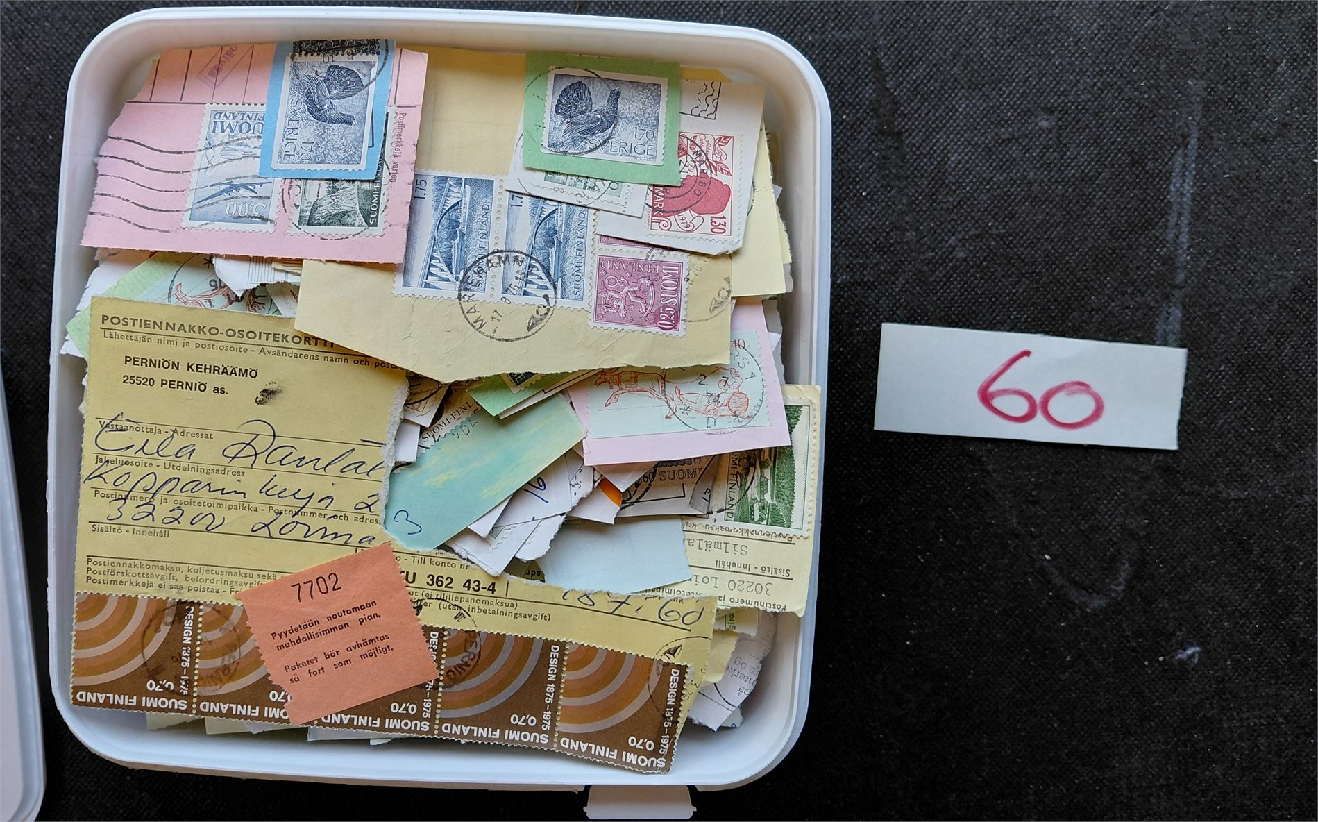 6. I tillegg til salgssummen kommer 10 % salær + omkostninger ved pakking, spedisjon, forsikring, porto etc. Auksjonen benytter Posten/Bring ved sending. Skal objektene sendes, vent med betaling til porto er lagt til. På brevforsendelser frankeres med frimerker som legges i plastlomme utenpå sendingene.