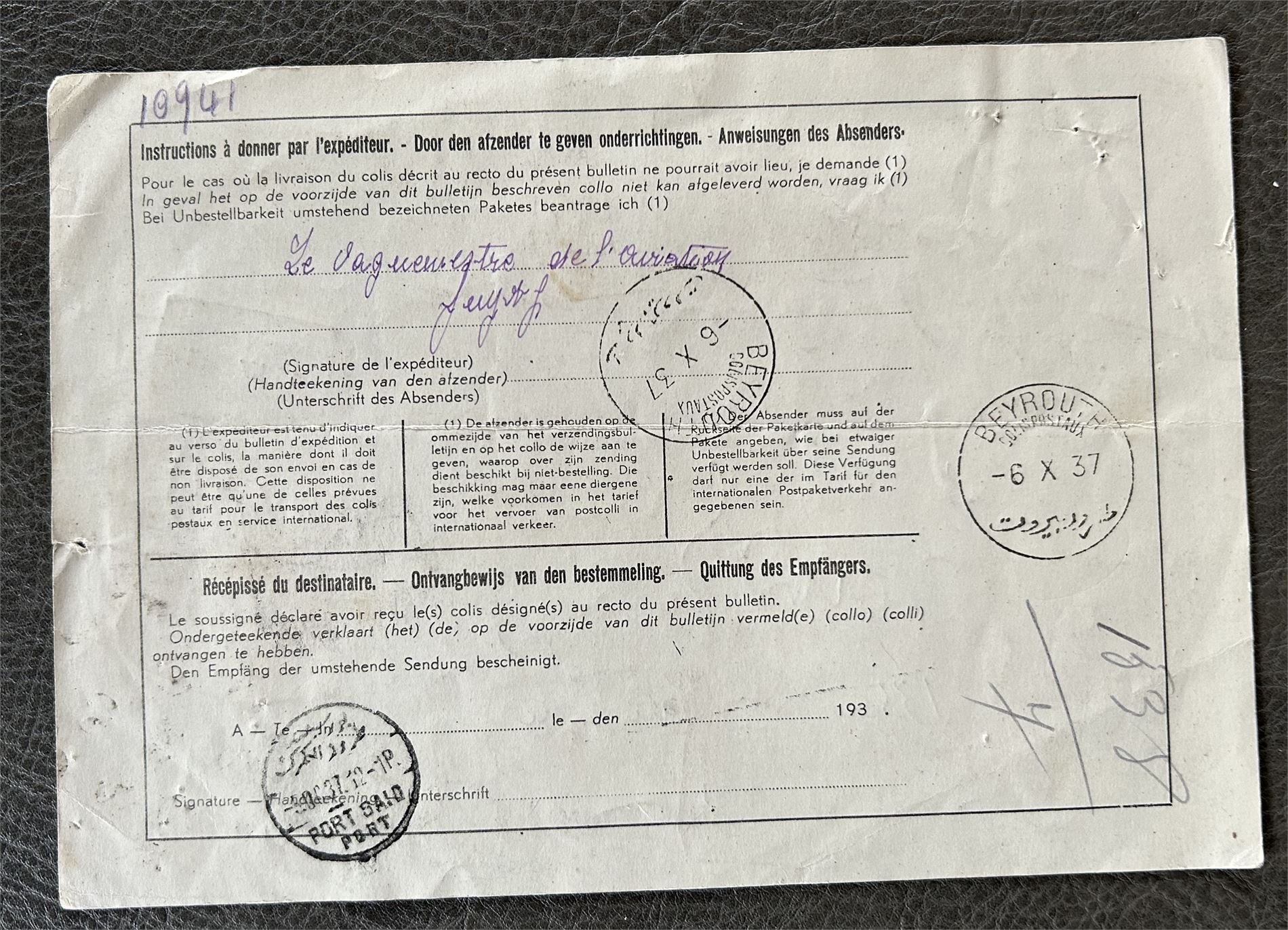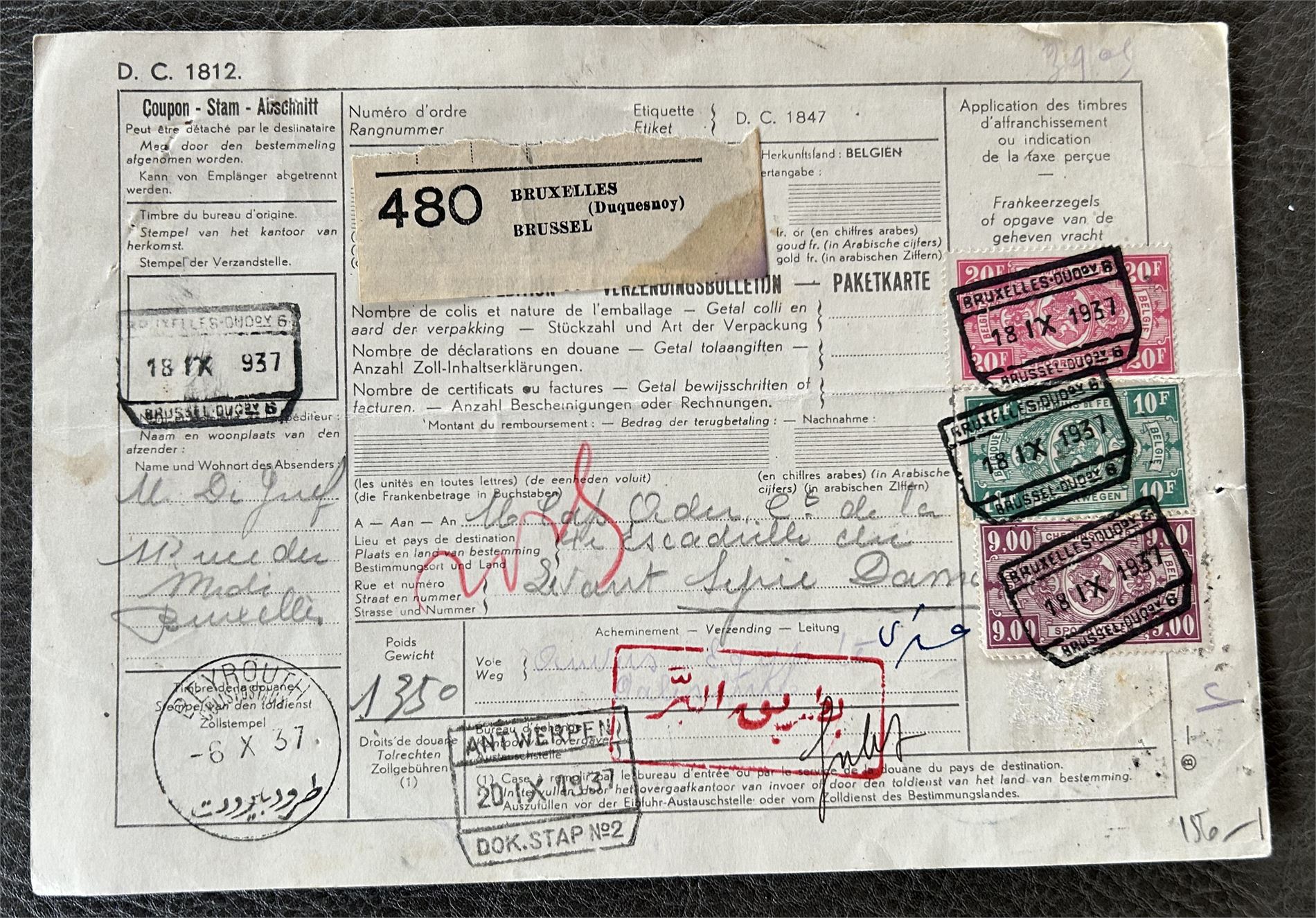 BELGIA-PAKKE ADRESSEKORT Bruxelles til Damascus, Syria 1937. Transittstempler Antwerpen, Port Said og Beyrouth. Uvanlig destinasjon