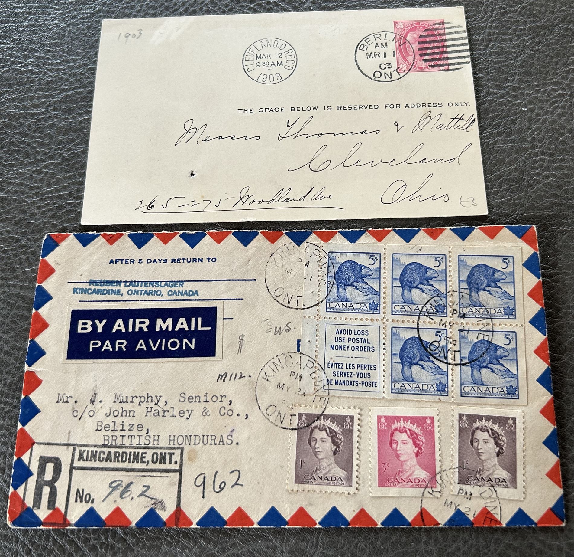 CANADA Helsak til USA stemplet "BERLIN, ONT 1903" og brev med hefteblokk med bever stemplet "KINKARDINE " til British Honduras