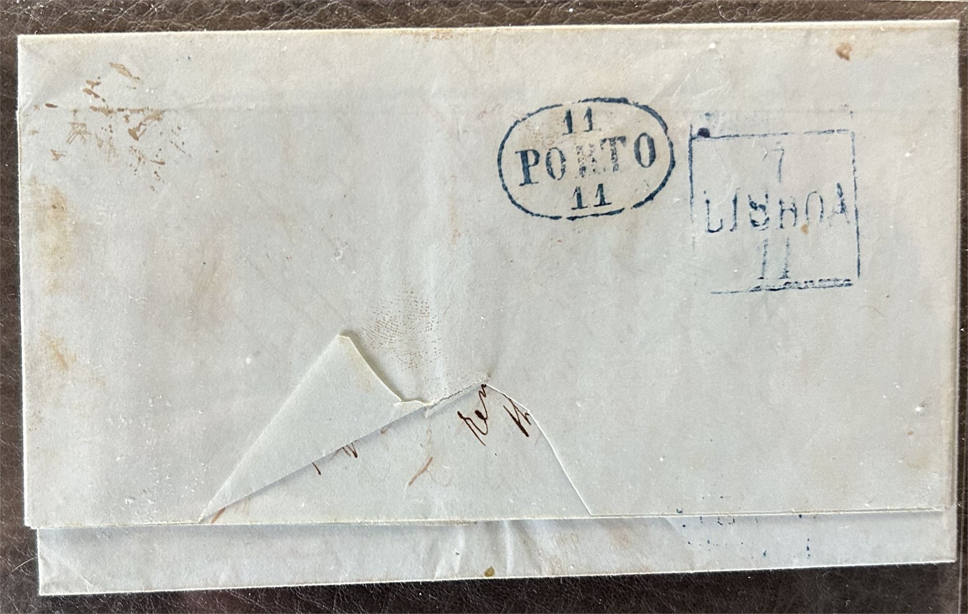 FRANKRIKE-PREFRIMBREV Marseilles til Oporto, Portugal per Gaditano. Diverse stempler foran og bak