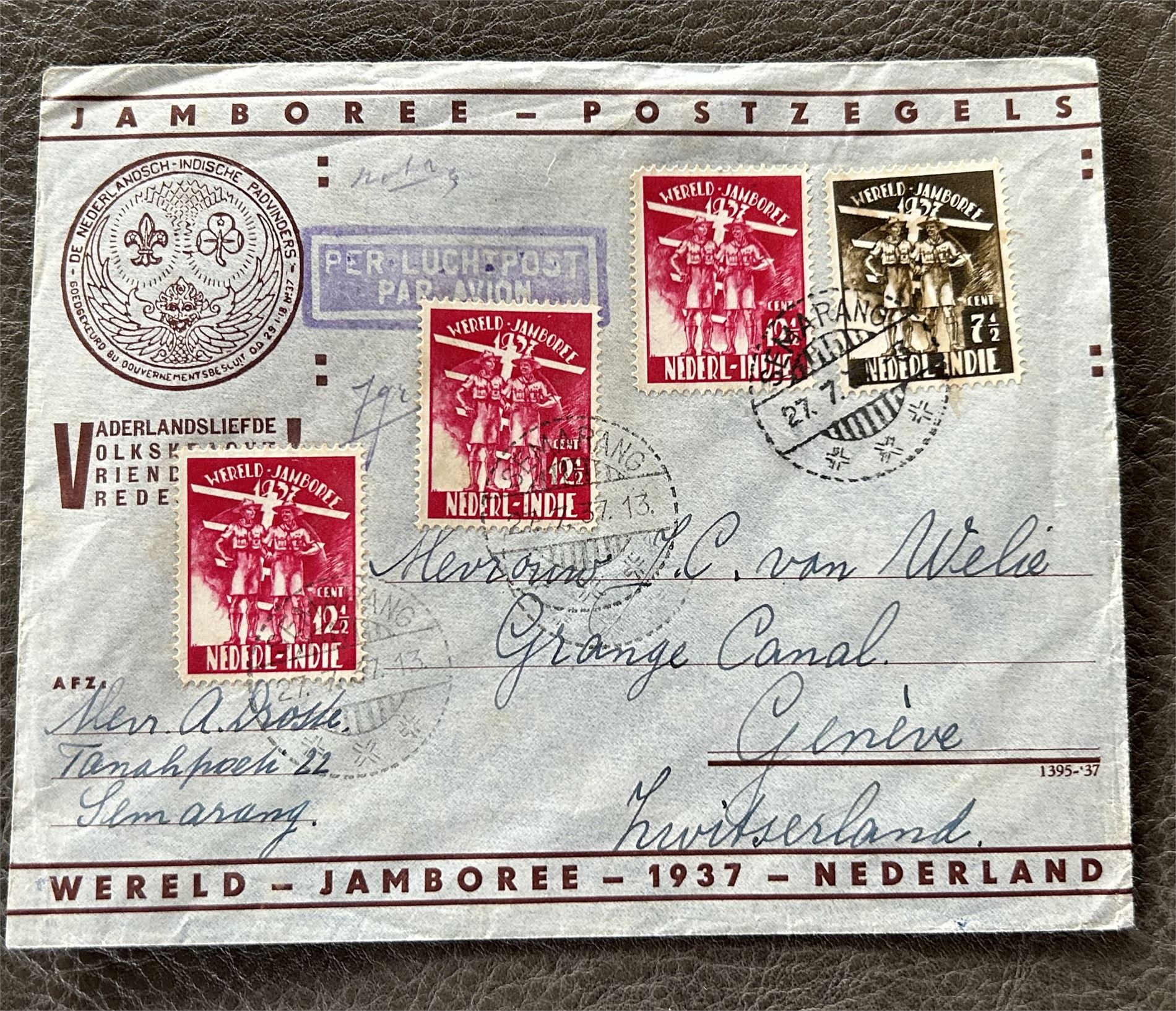 NED. INDIE Jamboree-brev til Sveits stemplet "SEMAPANO 27-7-37"