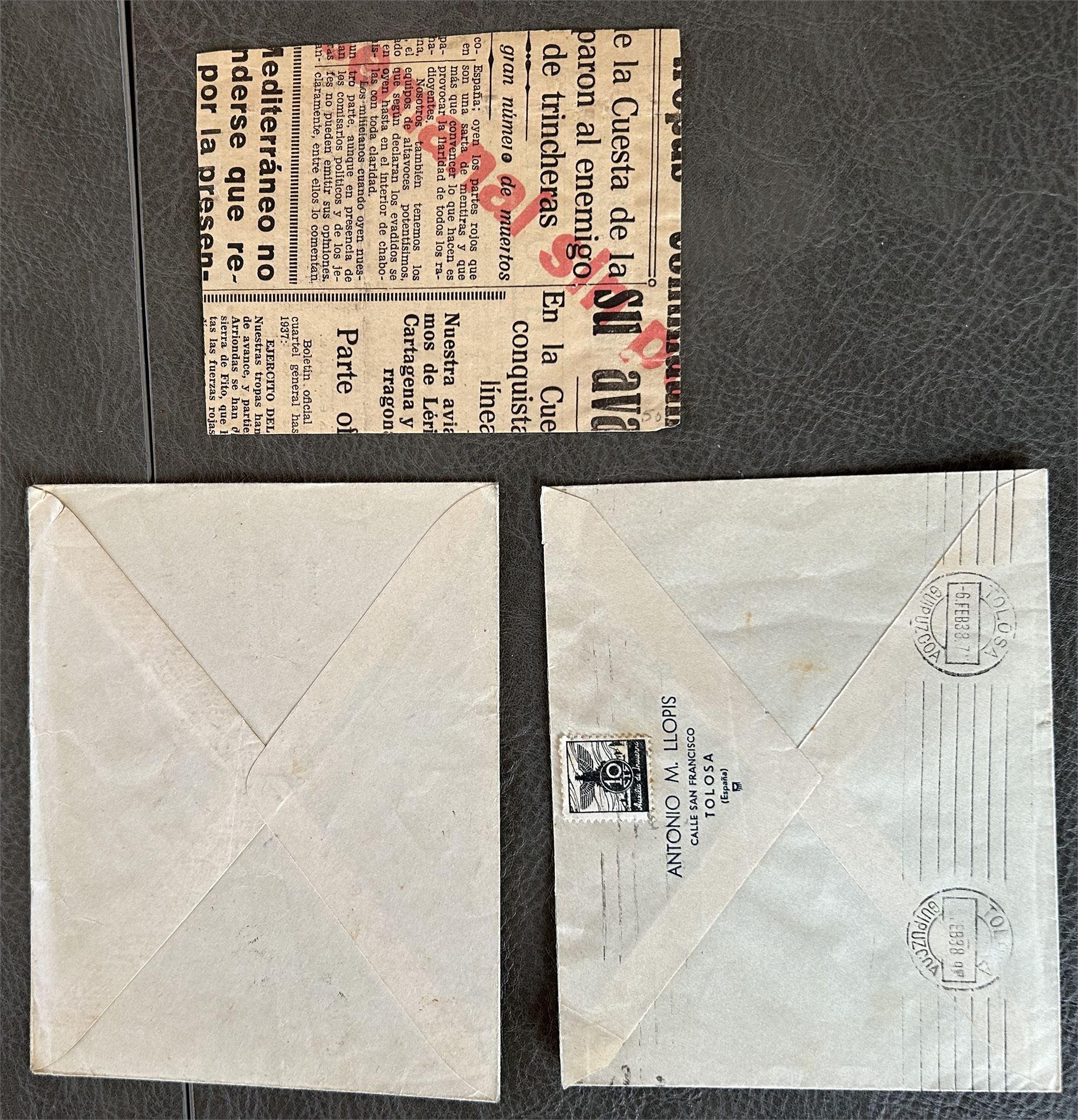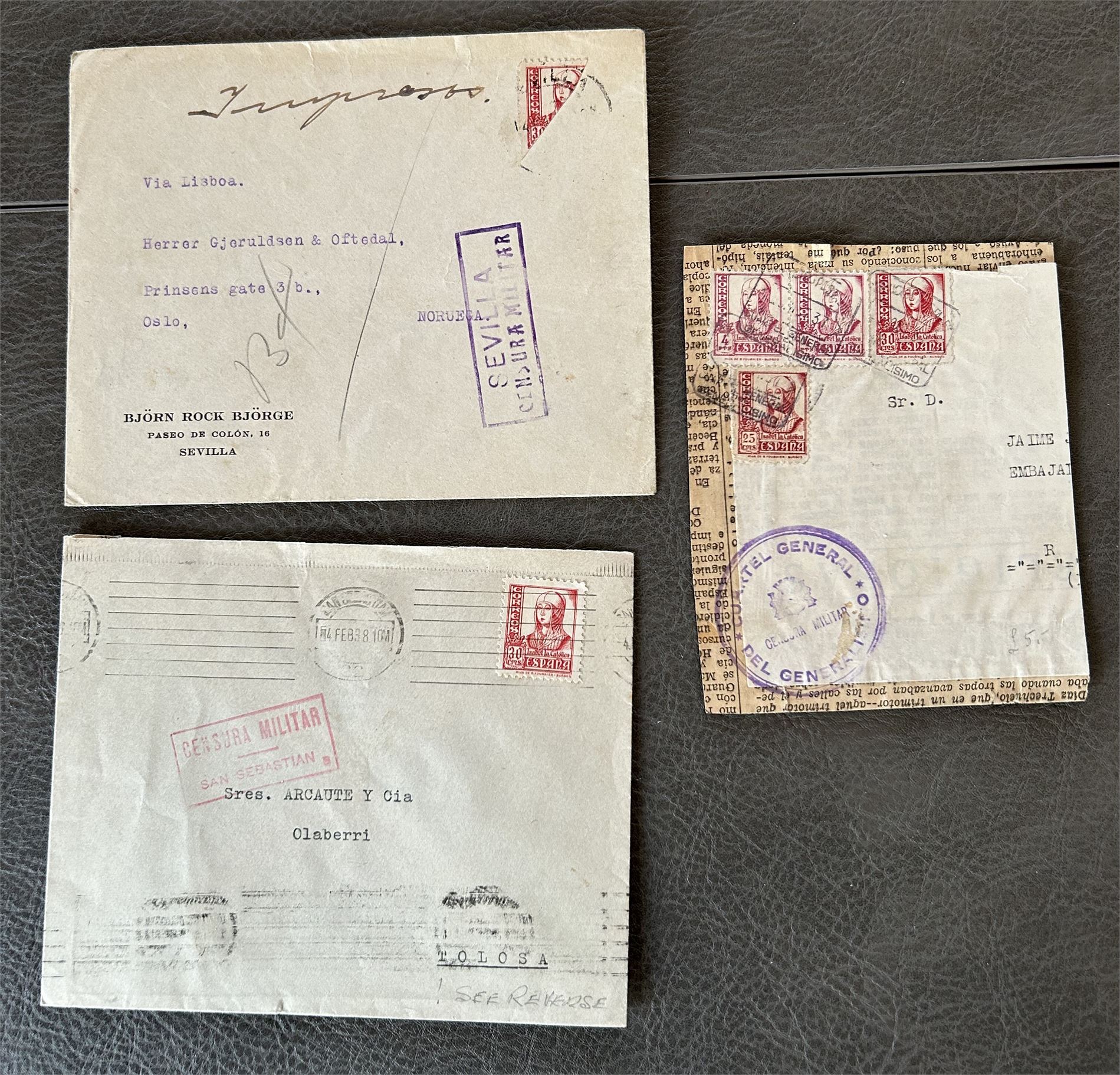 SPANIA-BREV 3 brev (et stort klipp) inkl et med halvert frimerke. Sensurstempler