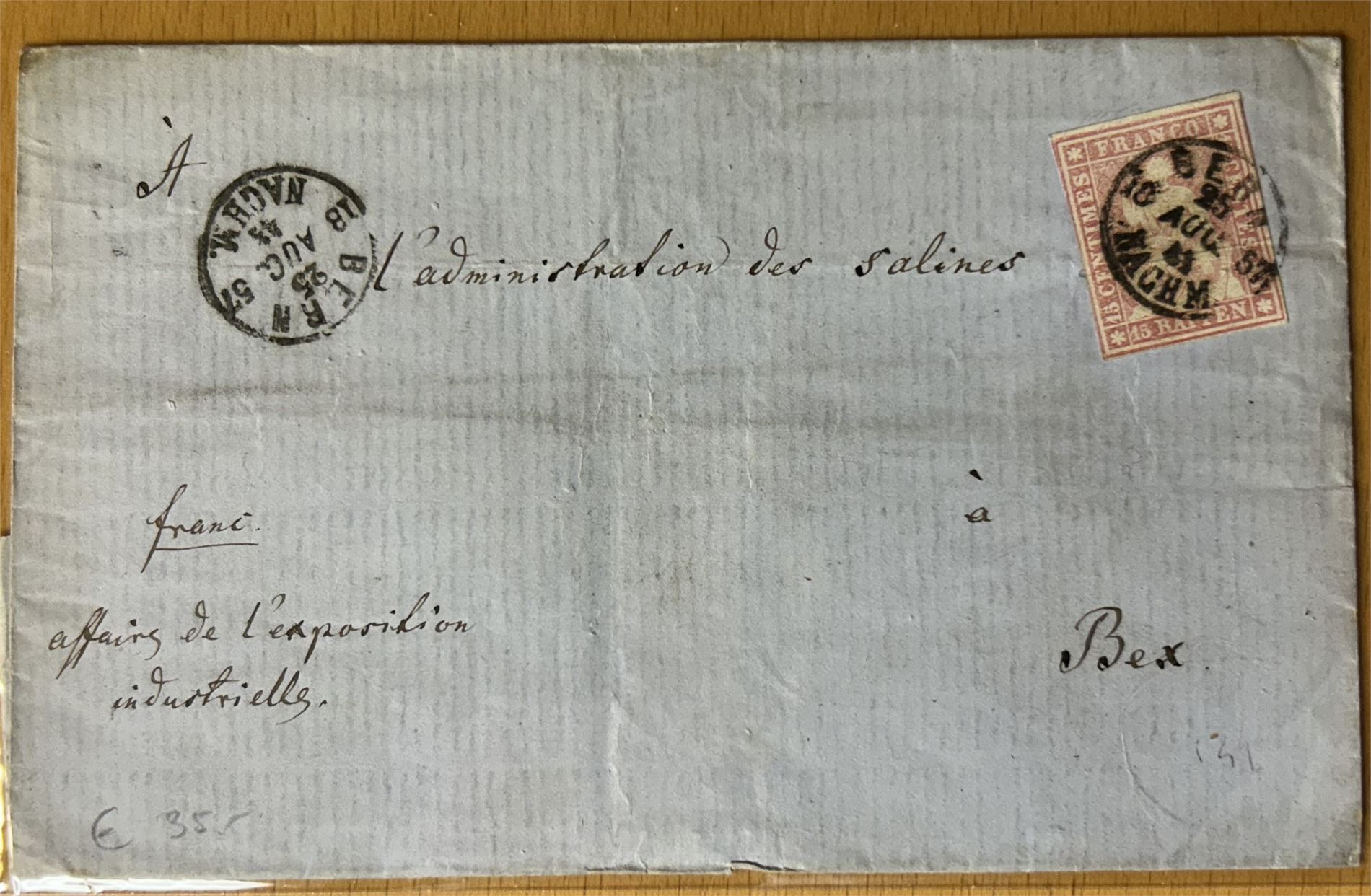 SVEITS Brev med 15r stemplet "BERN 25 AUG. 1857 NACHM." til Bex. Stempel brukt om ettermiddagen.