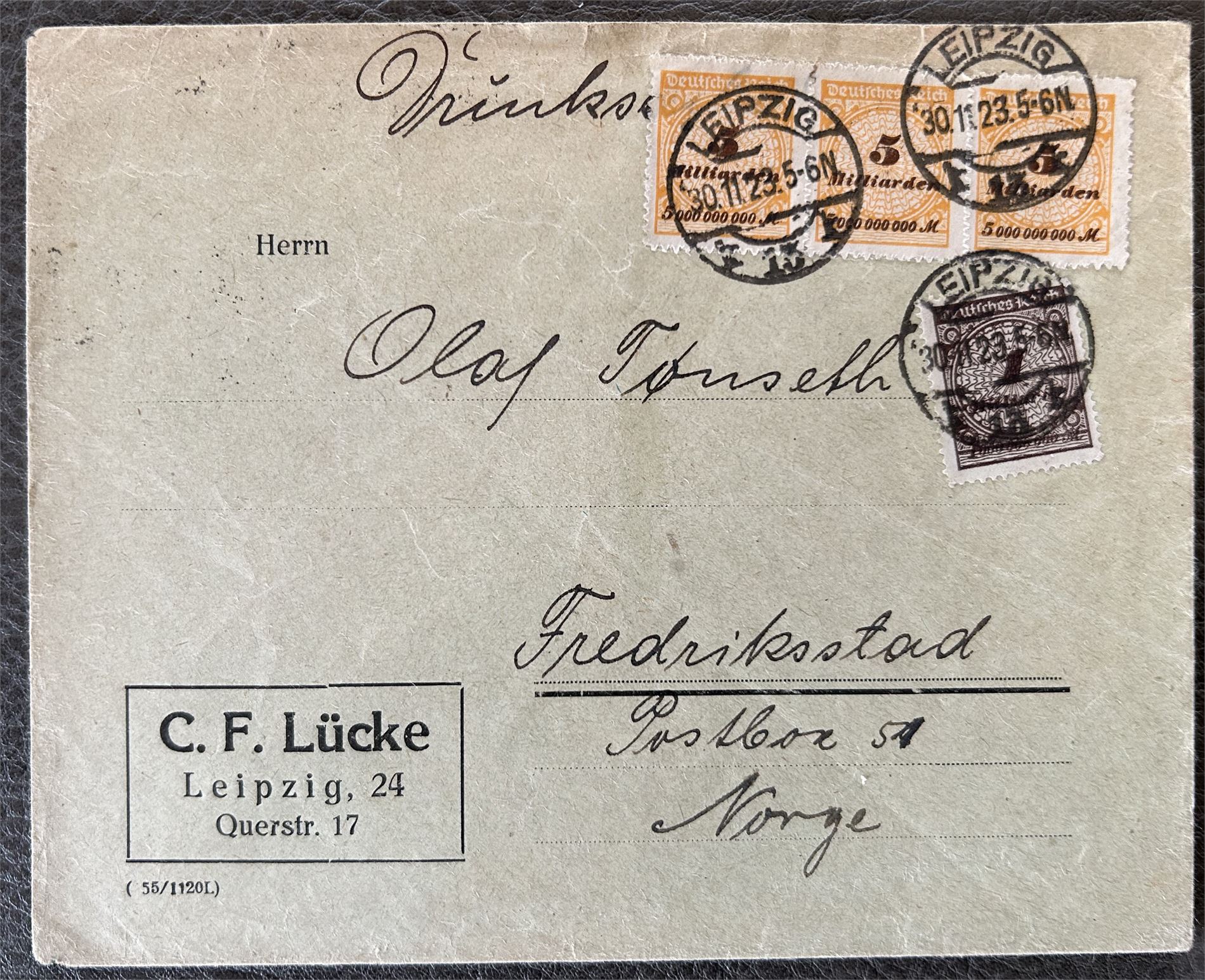 REICH-INFLASJONSBREV Brev stemplet "LEIPZIG 30.11.23" til Fredrikstad. Gyldig portosats i 5 virkedager