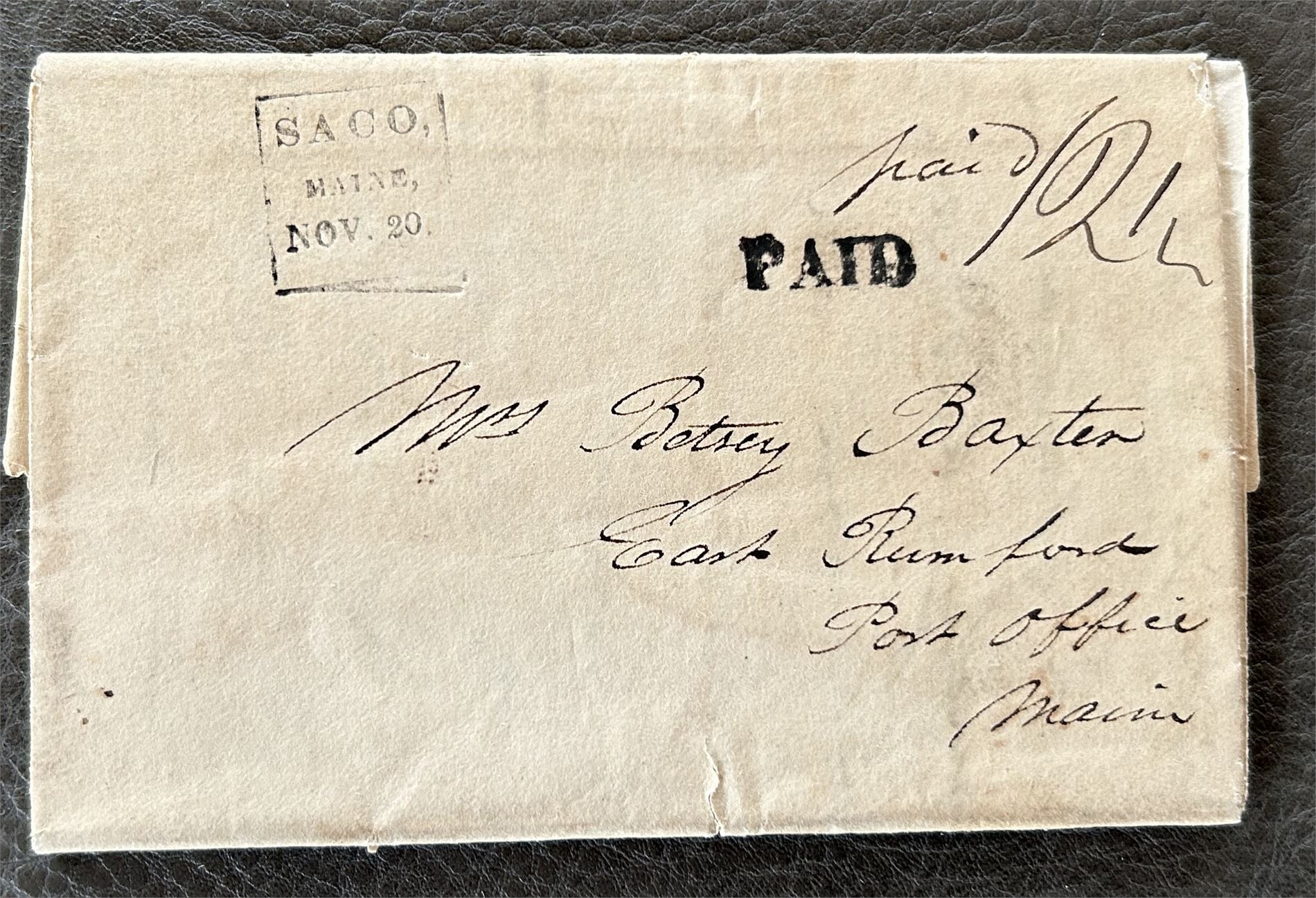 USA-PREFRIM Brev stemplet "SACO, Maine NOV 20" (1829).