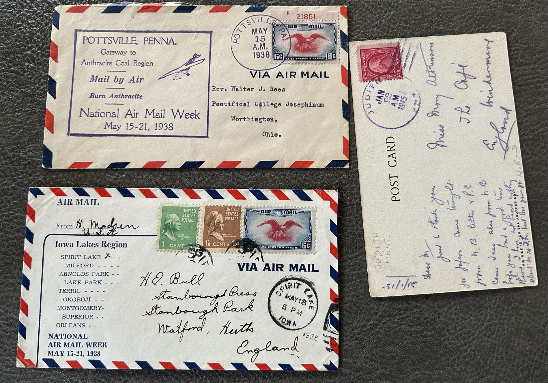 USA-BREV/KORT 3 stk stemplet "JUDITH 1915", "SPIRIT LAKE 1938" og "POTTSVILLE (PA) 1938