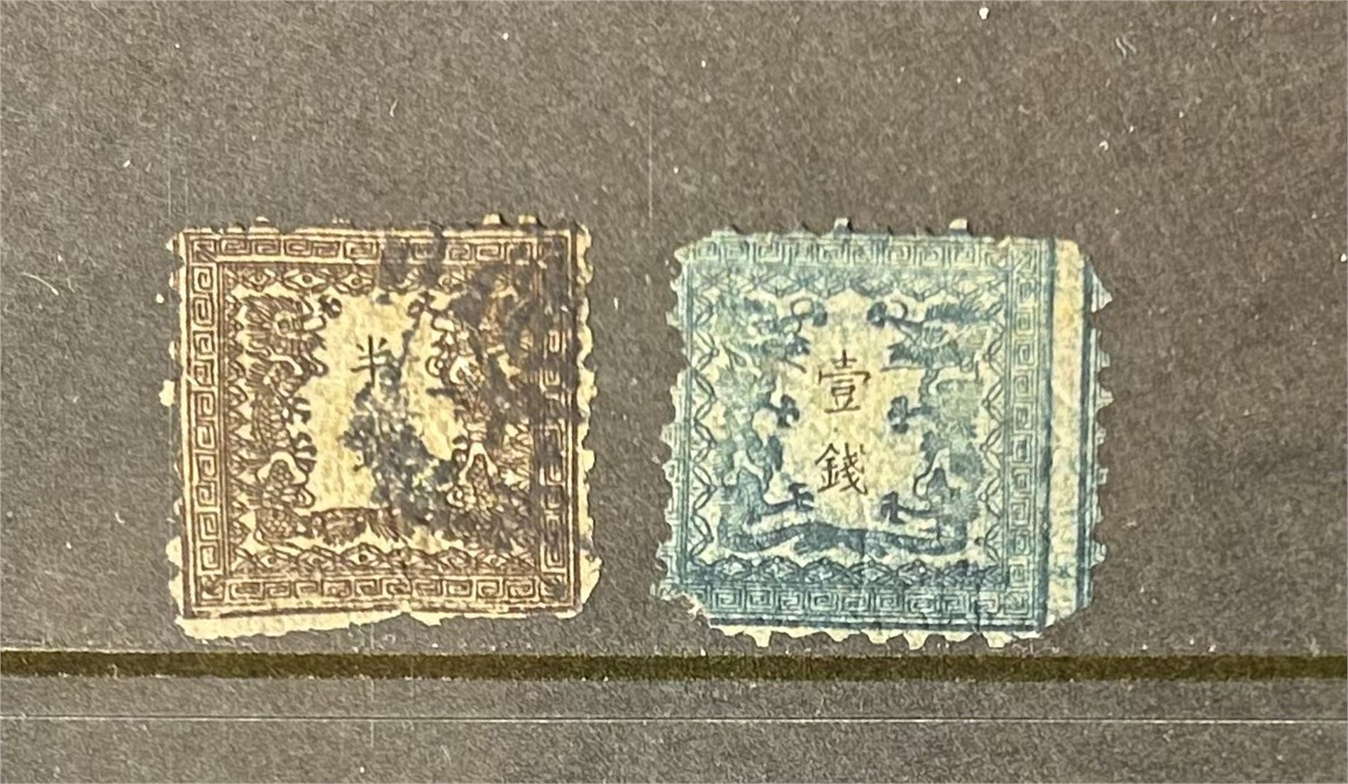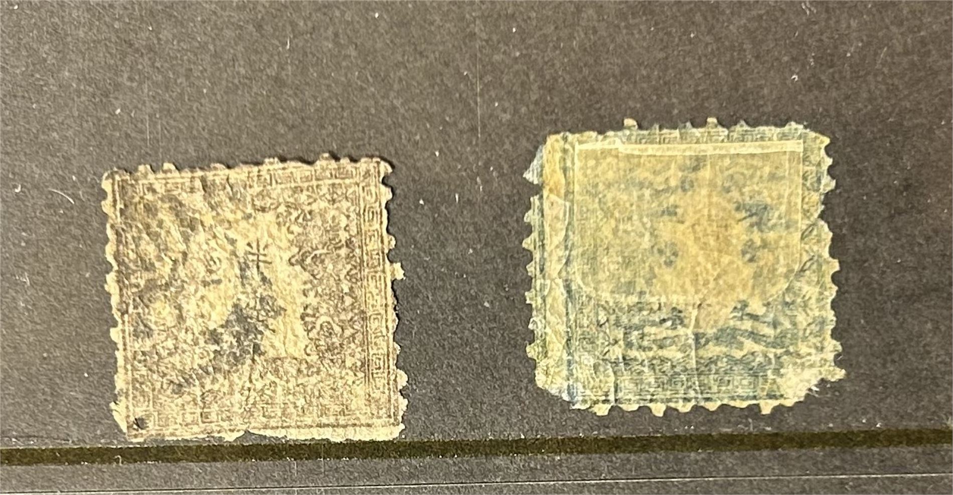 JAPAN o Mi 1-2. Nr 2 med rift som er hengselforsterket. Selges as-is, dette er faktisk normal kvalitet