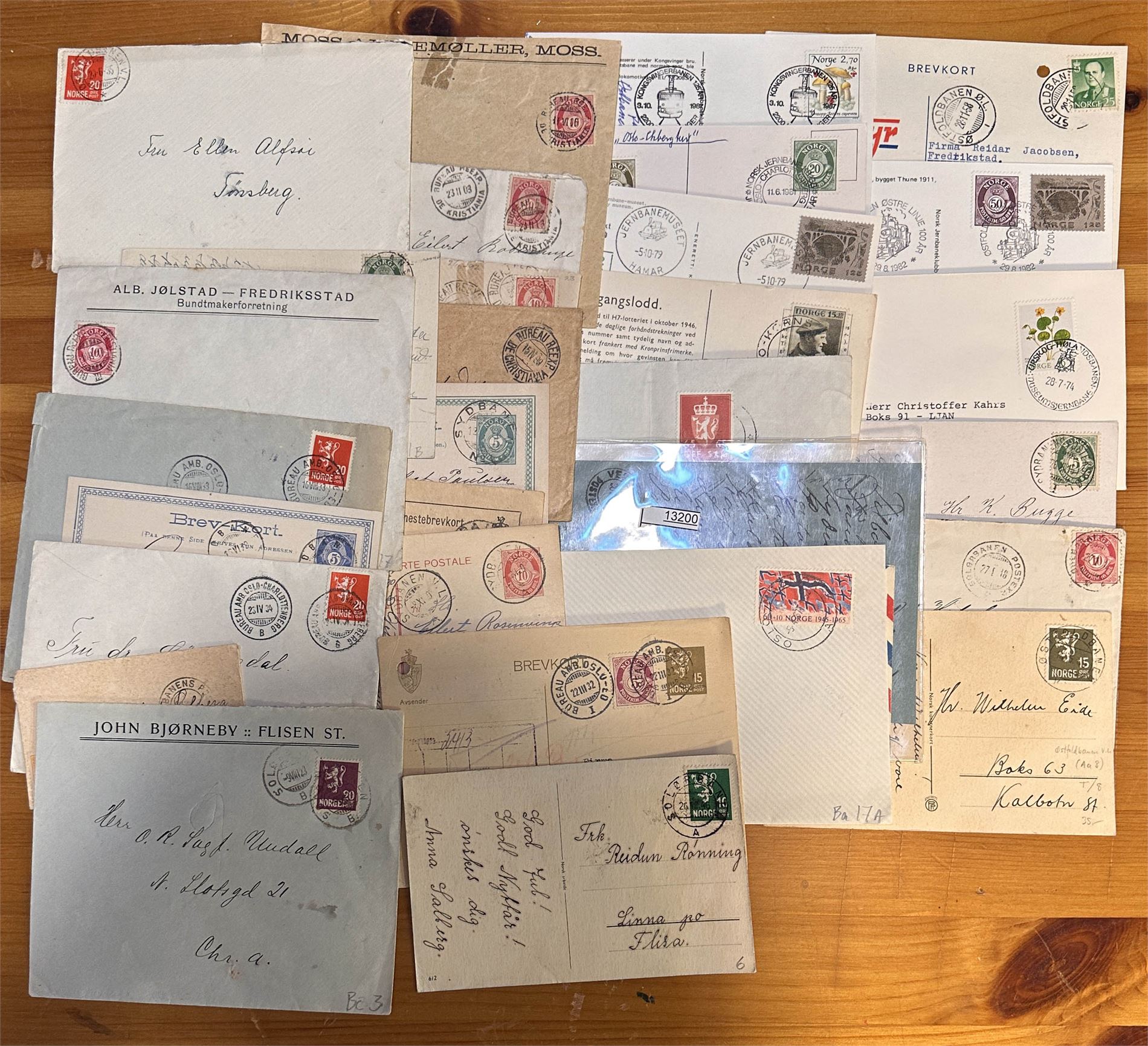 JERNBANE Realisasjon brev og kort med togstempler. Flere pene
