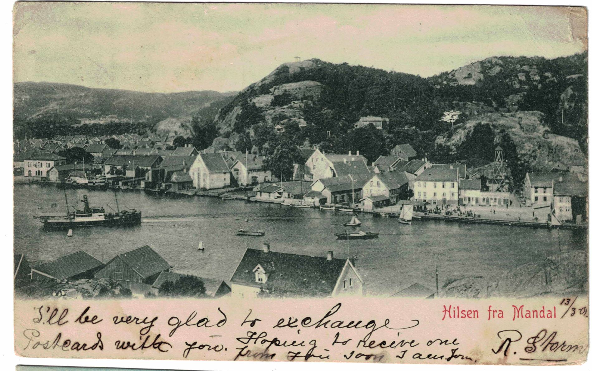 HILSEN FRA MANDAL (anonymt) Skrift foran, stemplet "MANDAL 13 III 01" til Napoli, Italia