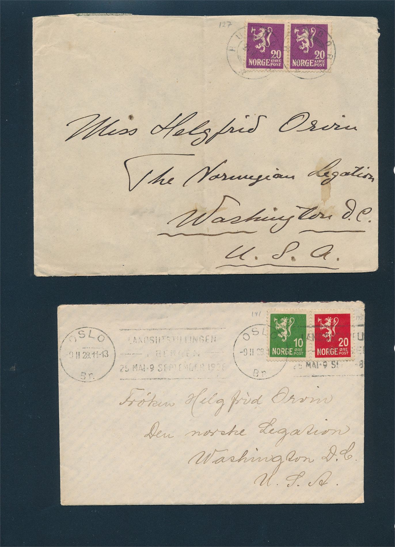KONSULATPOST 2 brev sendt til ansatt ved Den norske Legation, Washington DC 1928/30. GI BUD!