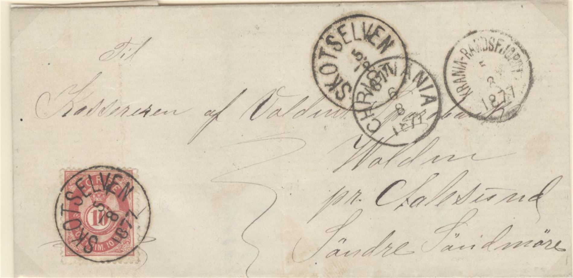 NK 25 I Brev med NK 25 I stemplet Skotselven 5/8-1877 sendt til Aalesund. sidest. Krania - Randsfjord II 5/8-1877 og Chra. 6/8-1877
