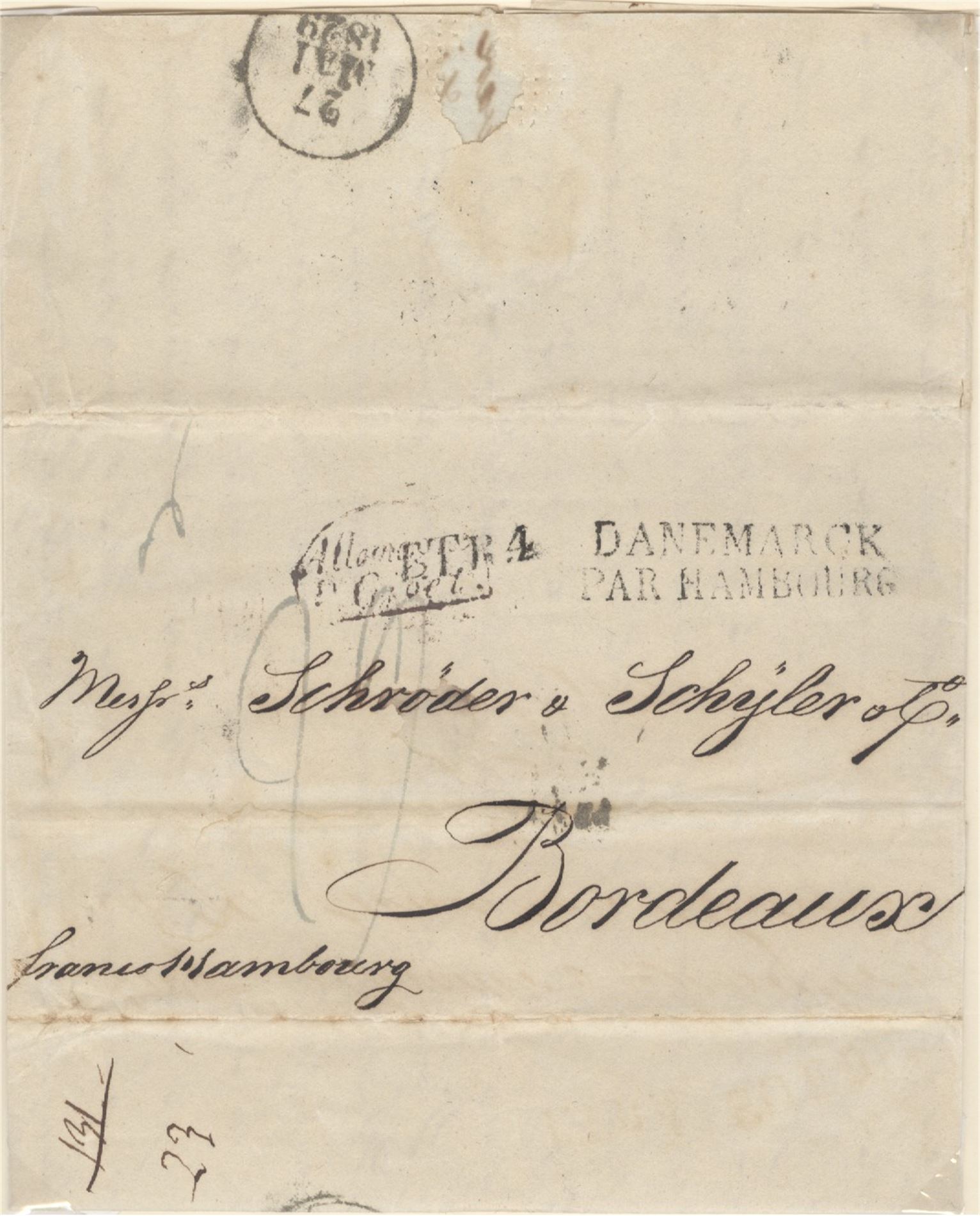 Prefil Brevomslag fra Christiania datert 11. mai 1829 til Bordeaux. Med "Danemarck par Hambourg" "Allemagne par Givet" T.T.R.3 kartering og "Franco Hambourg".
