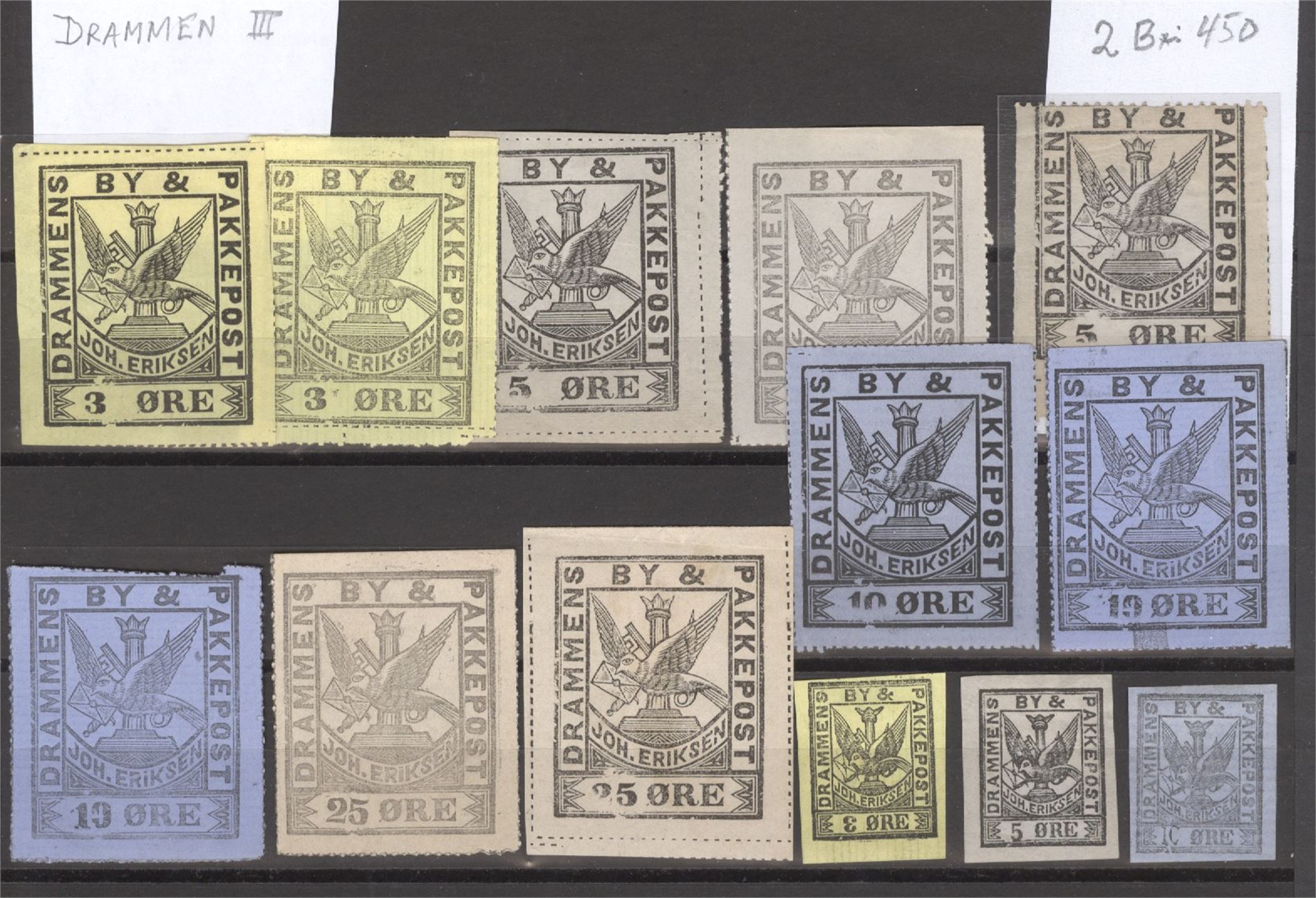 Bypost Drammen Bypost III. Samling med alle 7 hovednummer og flere variasjoner.