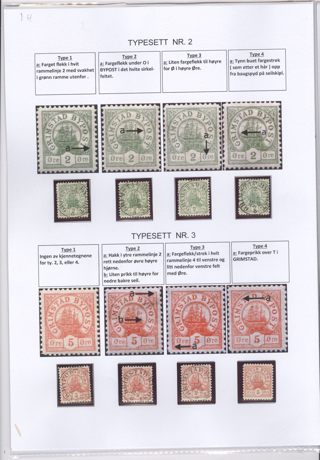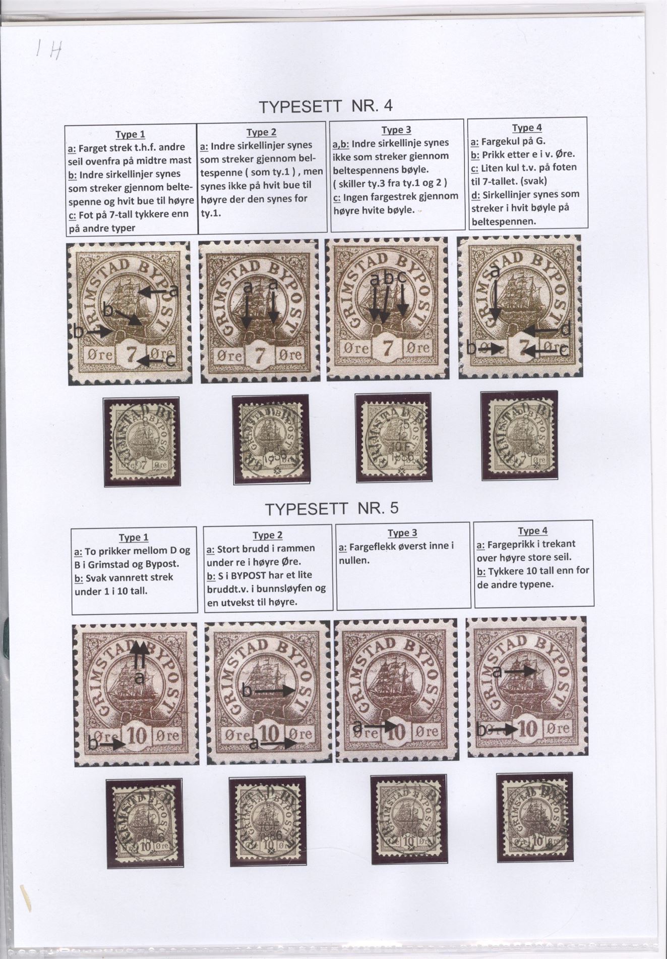 Bypost Grimstad Bypost. Komplett typesett for alle fem merker. Til sammen 20 merker hvorrav 19 er prakt/lux stemplet , ett ustemplet. Sammenligning er montert på ark m/fargeillustrasjoner og beskrivelse av klisje-kjennetegn. Typer er ikke kekjentgjort på denne måten tidligere.