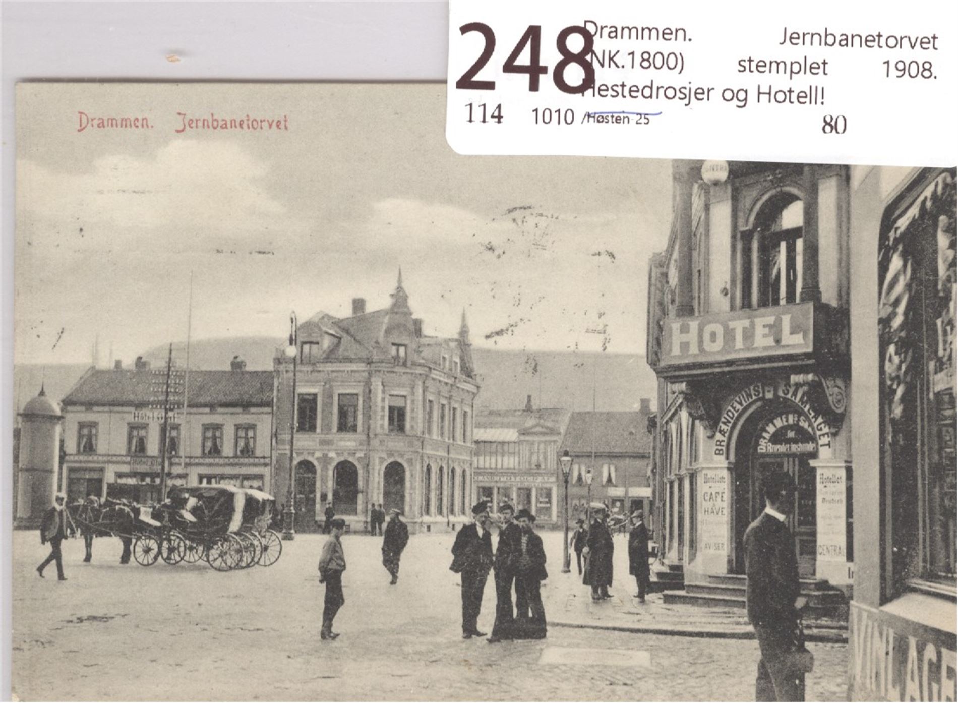 Drammen. Jernbanetorvet (NK.1800) stemplet 1908. Hestedrosjer og Hotell!
