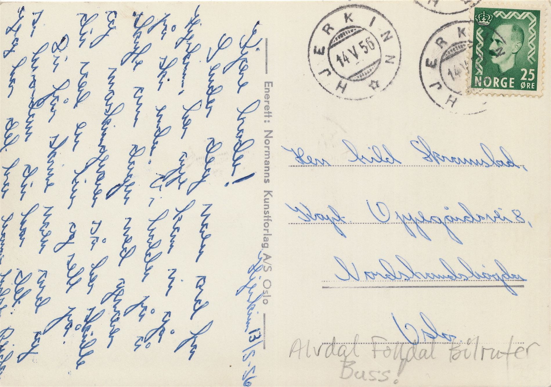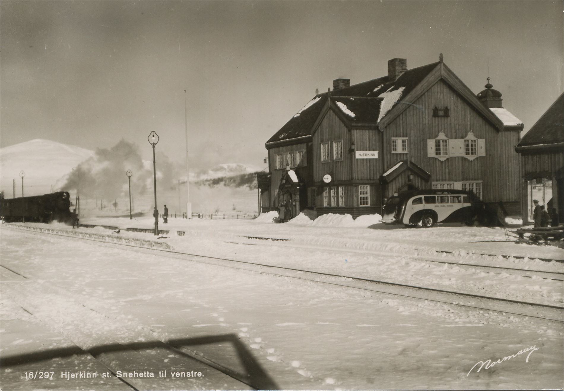 HJERKINN stasjon, med dampende tog og buss (OP) A6 s/h (Normann 16-297) brukt 1956