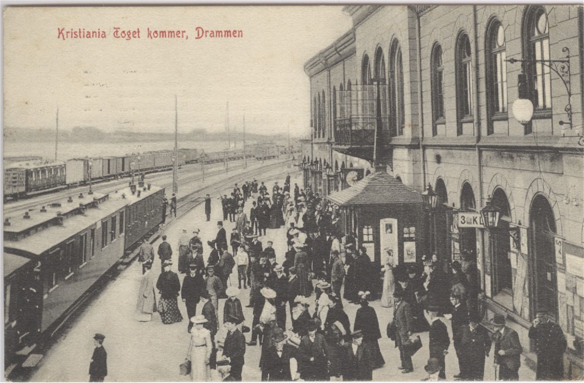 Drammen, Kristiania Toget kommer Livlig motiv uten utgiver stemplet-06
