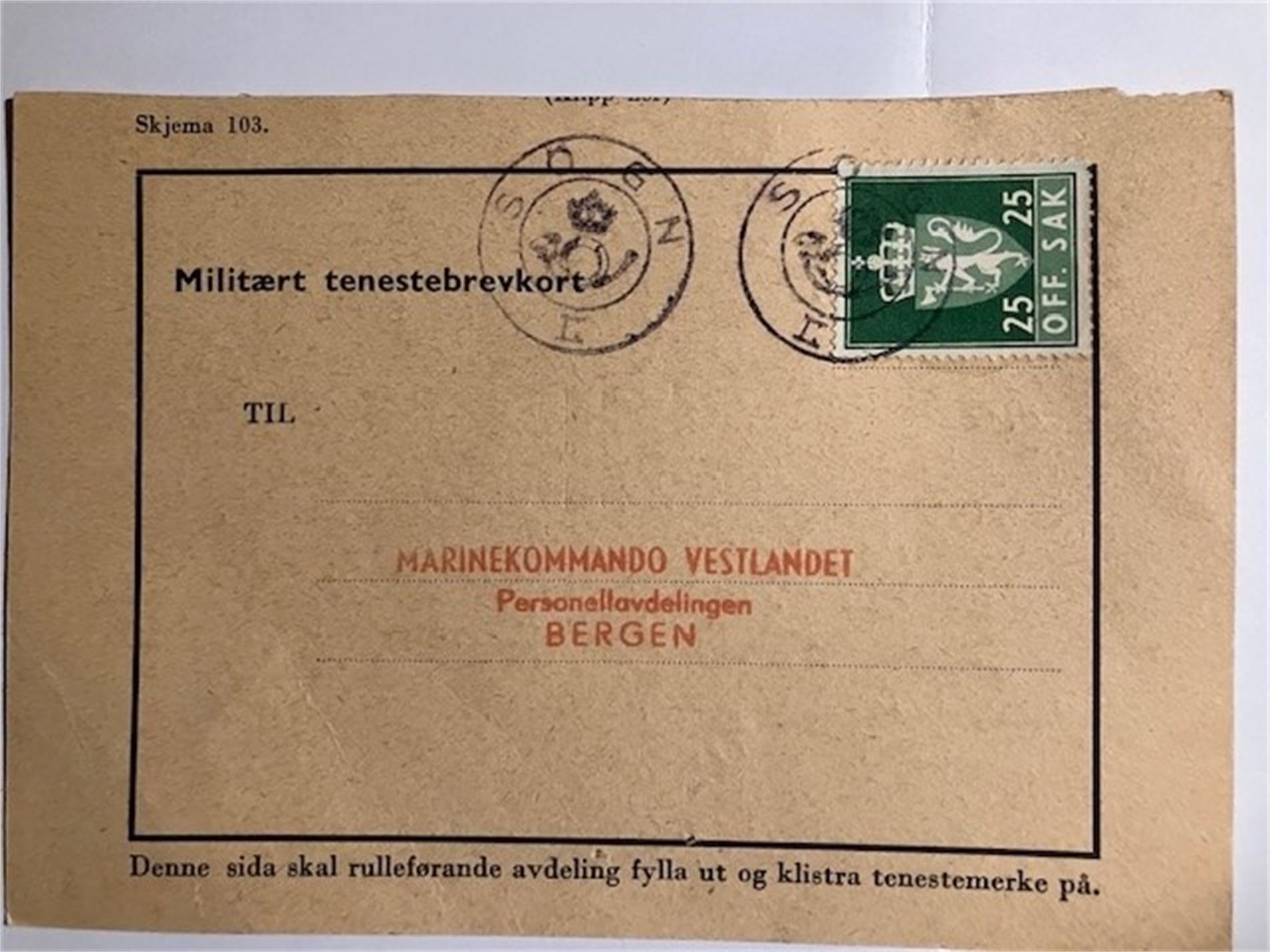 Sogn II - bakside datert 11.11.1960 - Tjenetsebrevkort