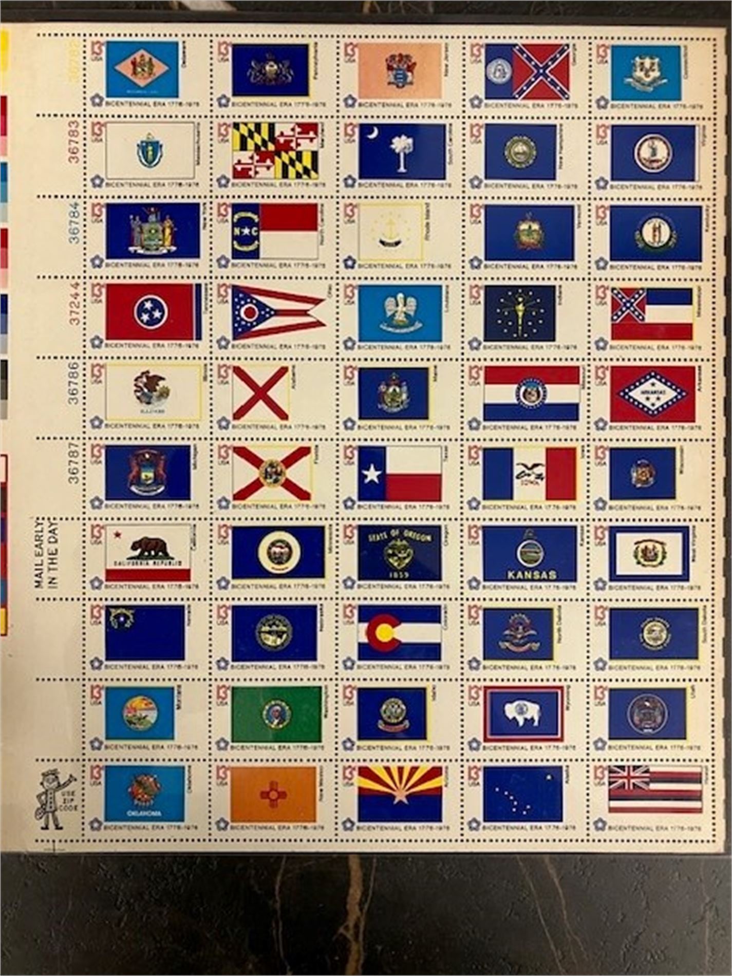 Pent album med et brev med flagg fra USA-stater + et postfrik helark med merker.