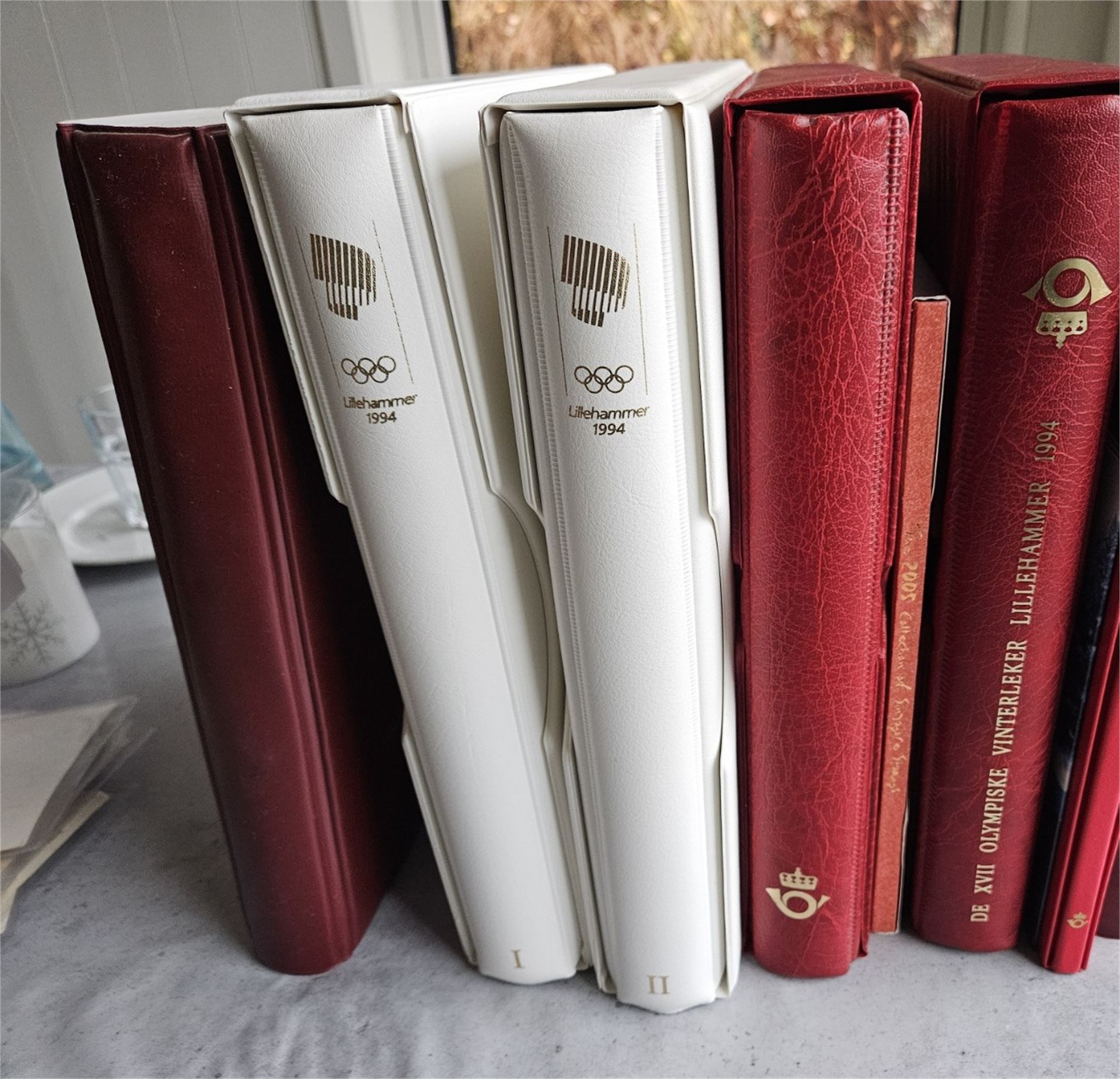 2 stk OL-94: 1 - Norge FDC, spesialstempler og postfriske merker/ark pålydende ca 750, samt årbok 1994 og årssett 1995. 2 - OL-samlingen i 2 hvite album. Medfølger Årssett Singapore 2005 og Postens røde perm med skilleark (tom)