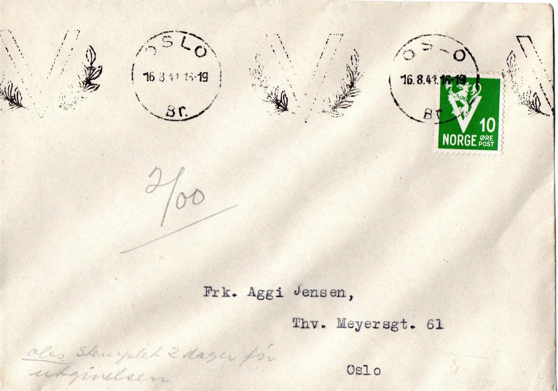Stemplet med maskinstempel med V og eikeløv, Oslo BR, 16/8-41. Dette er to dager før offisiell FDC dato. Se NK for nærmere info.
