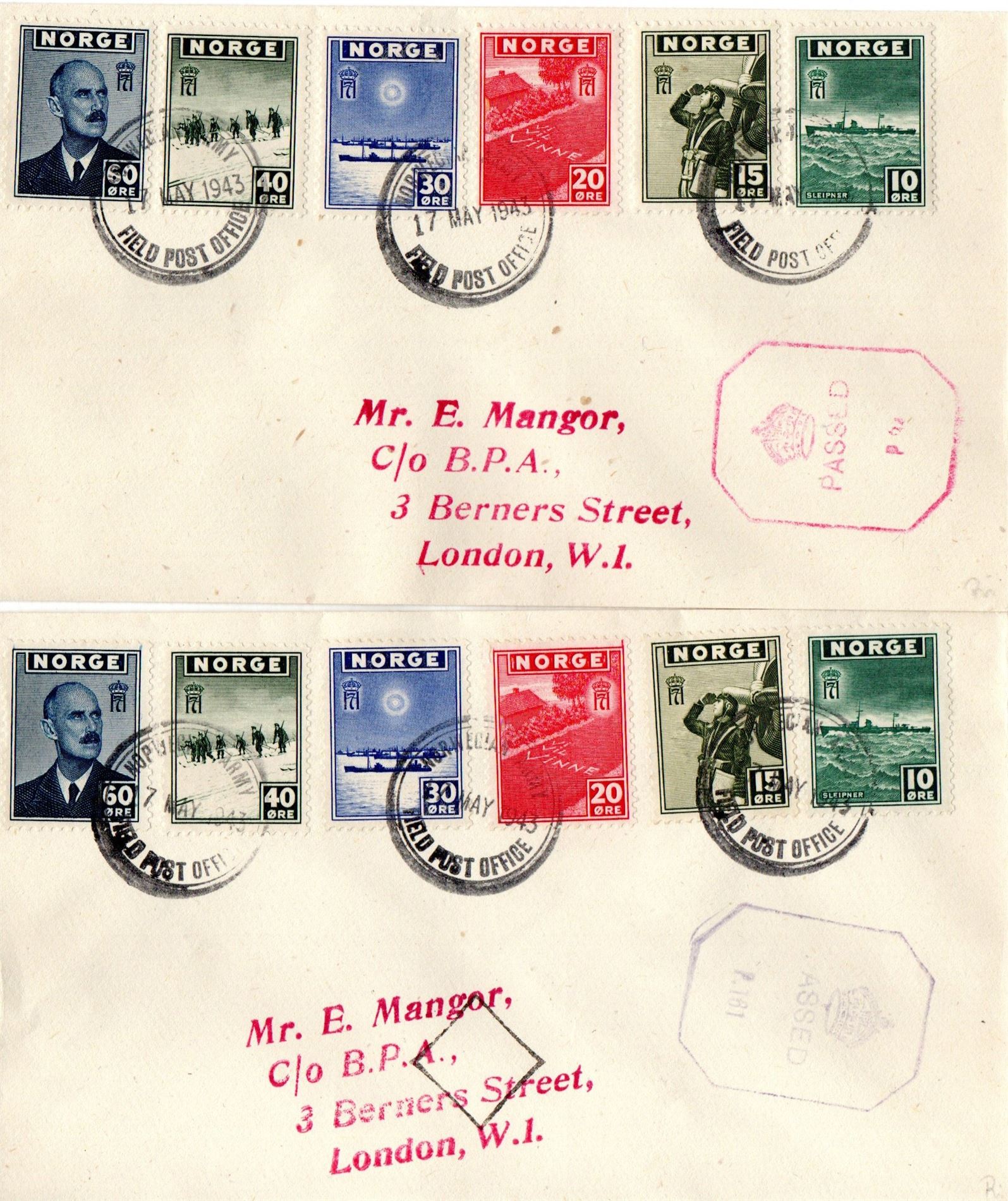 2 brev frankert med NK 333-338. Stemplet NORWEGIAN ARMY FIELD POST OFFICE 17 MAY 1943 og engelsk sensurstempel.