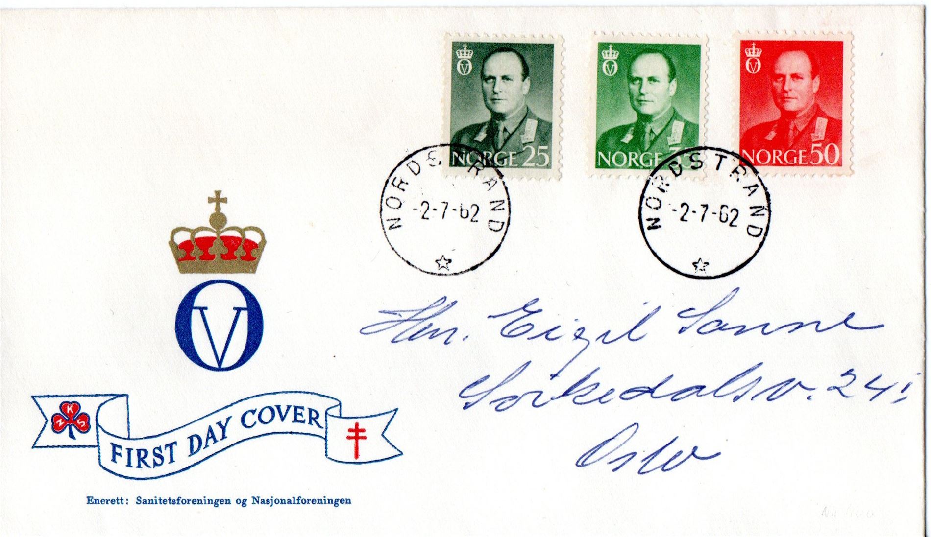 Adressert konvolutt fra Sanitetsforeningen og Nasjonalforeningen. Stemplet Nordstrand 2/7-56