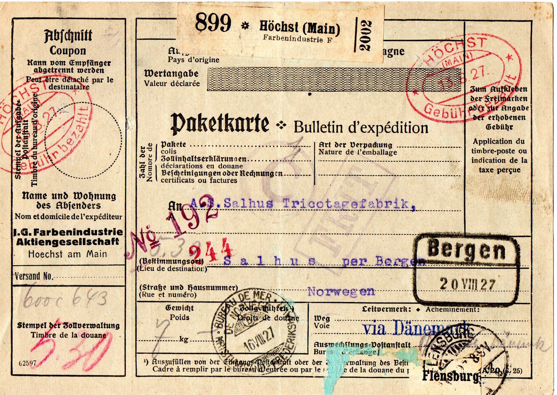 Tysk pakkepost, Bulletin d`expèdition. Sendt fra Höchst til Bergen i august 1927. Stemplet Flensburg og skipspoststempel Bureau de mer, litra B, Kristiansand- Frederikshavn. Pakkepoststempel Bergen 20VIII27. Blått gummistempel C i sirkel og kvadratisk gummistempel med teksten FRIT.