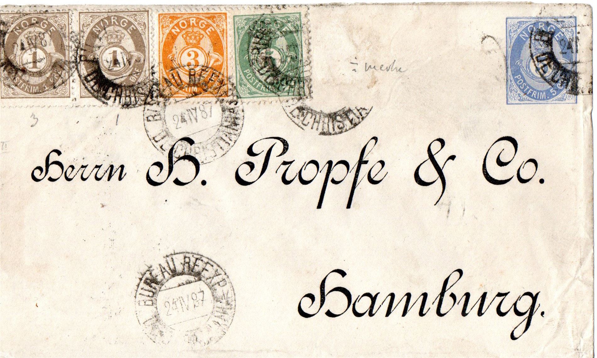 Oppfrankert helpostkonvolut, 5 øre frankert poshorn (3). Sendt til Hamburg. Oppfrankert med 5 frimerker, hvorav ett stk. er fjernet. NK 49 i to typer, 3 øre 21 mm og 5 øre 20 mm (ikke typet).