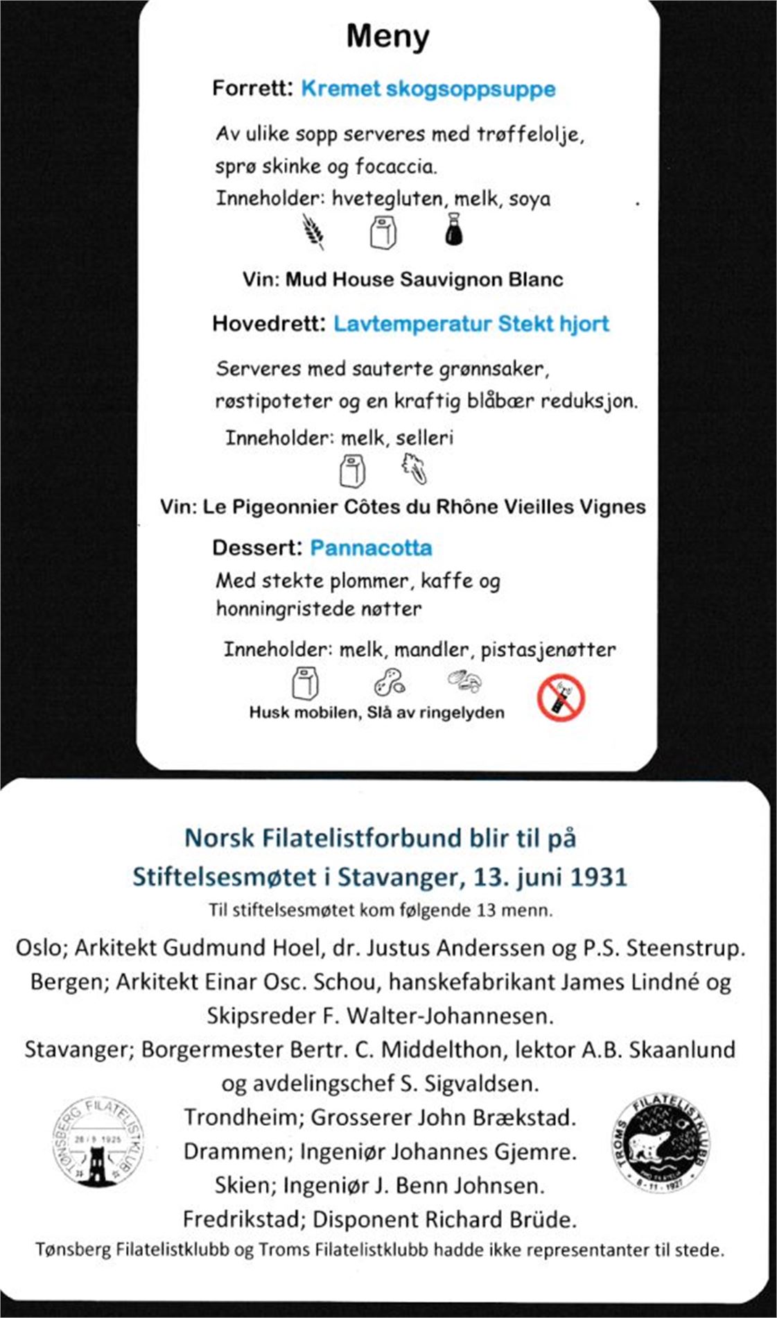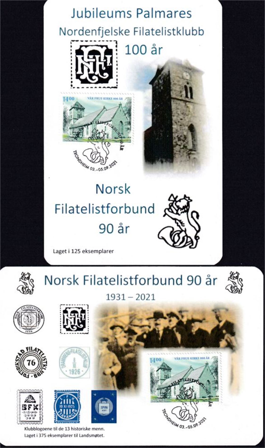 Menykort til Nordenfjeldske 100 års jubileum og minneblokk for Norsk filatelistforbunds 90 årsjubileum.