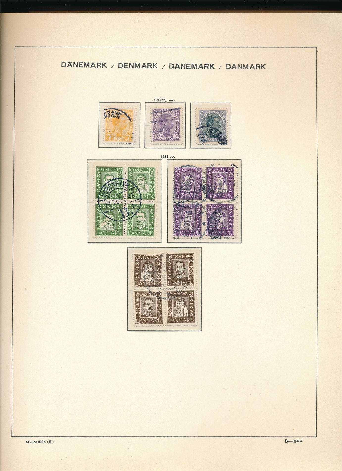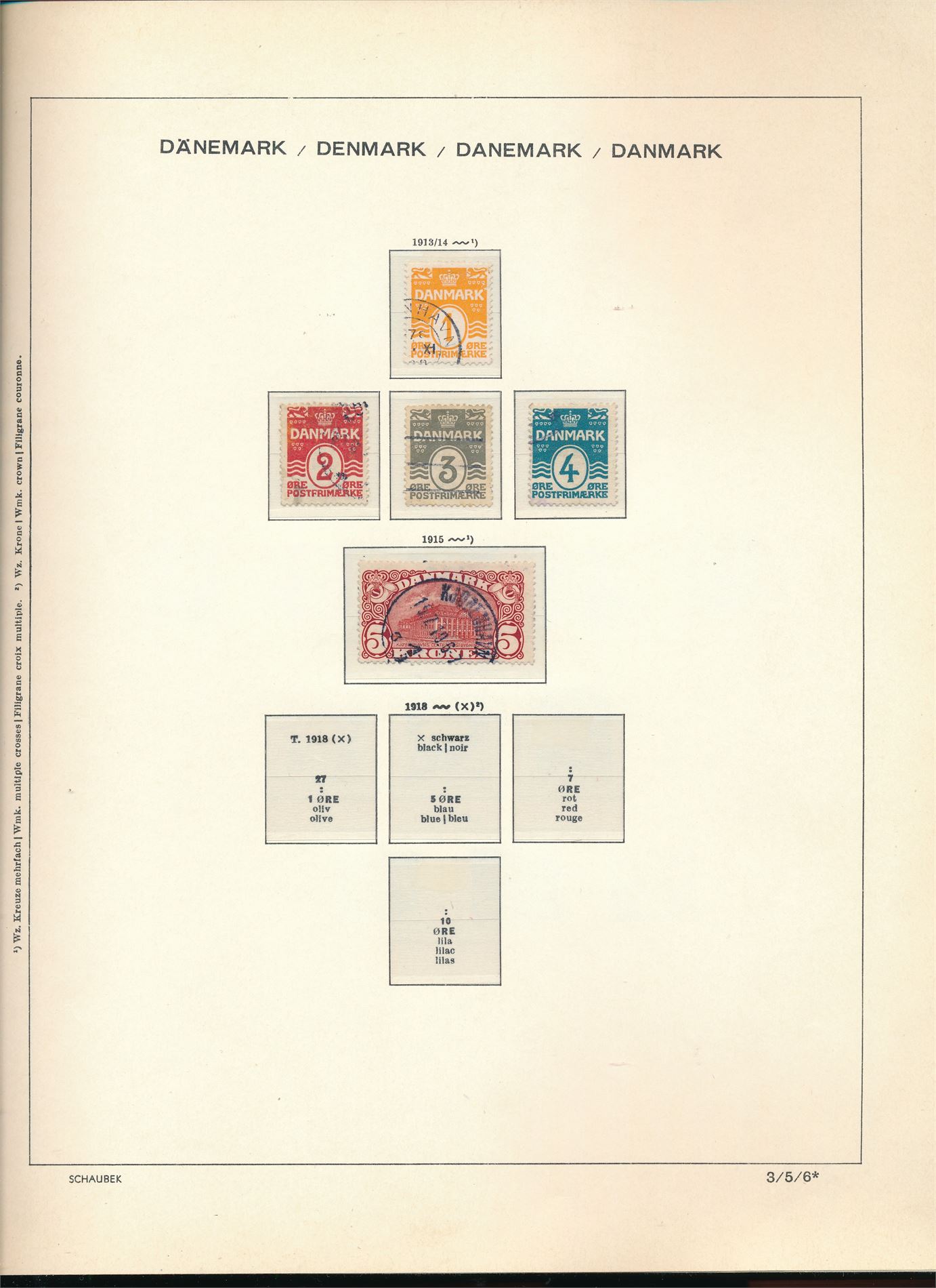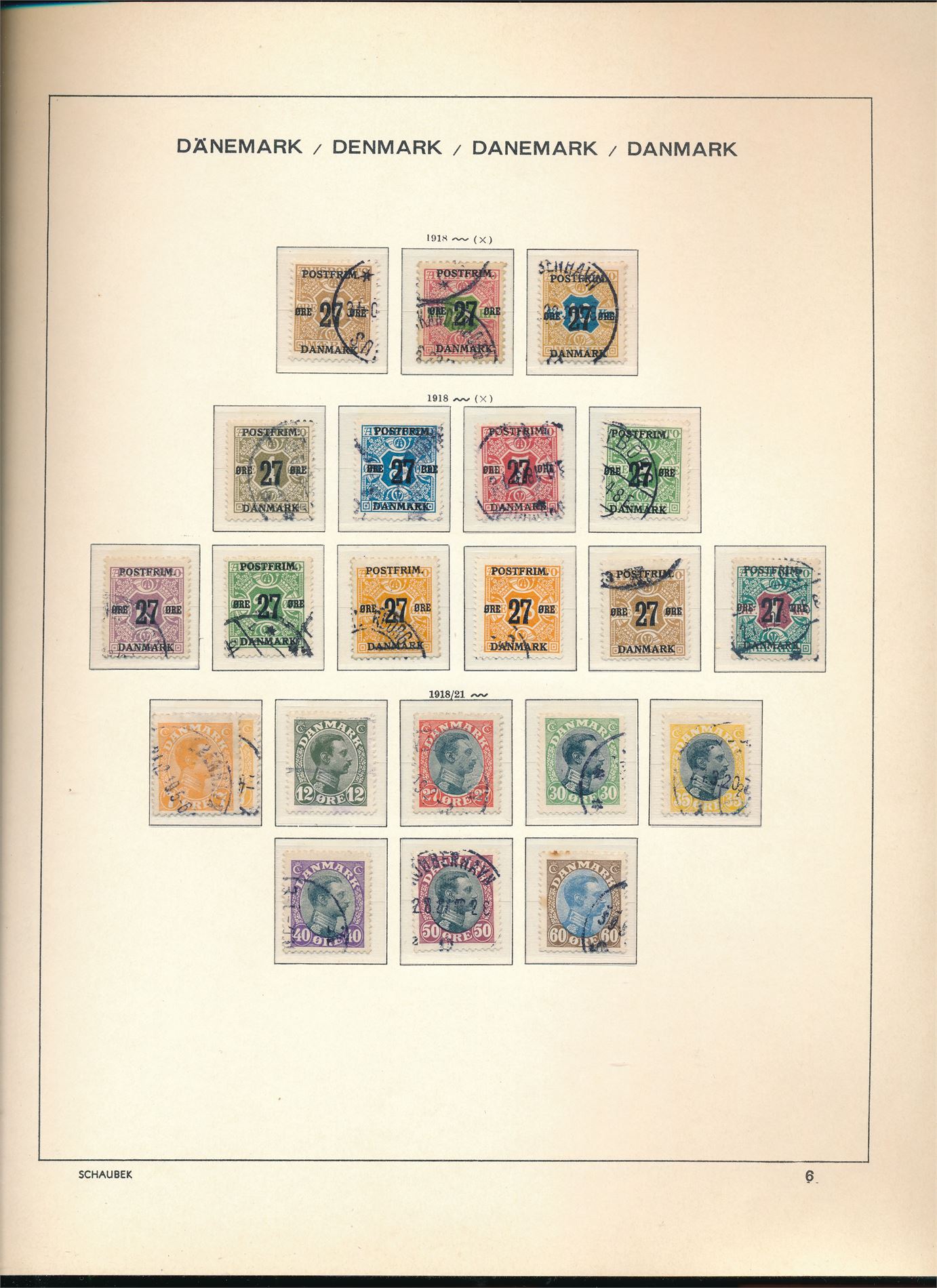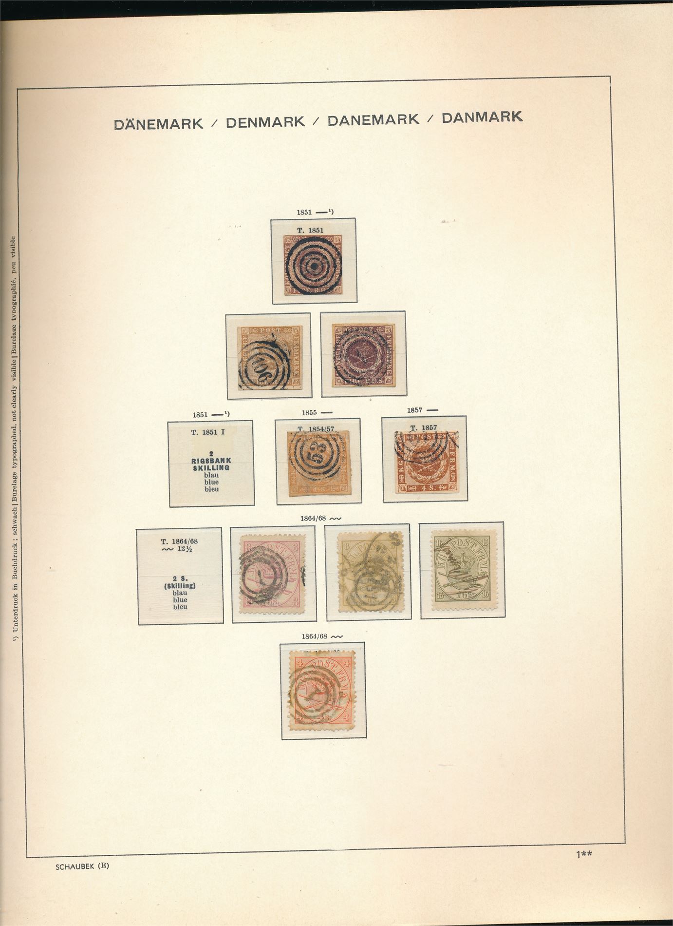DANMARK Vesentlig stemplet samling i Schaubek fortrykk til 1981. Nr 2 har hull i merket, ellers er samlingen fyldig med 2 posthus. Vannmerker og tagginger ikke sjekket. Også noe GRØNLAND bak inkl Thule-serien