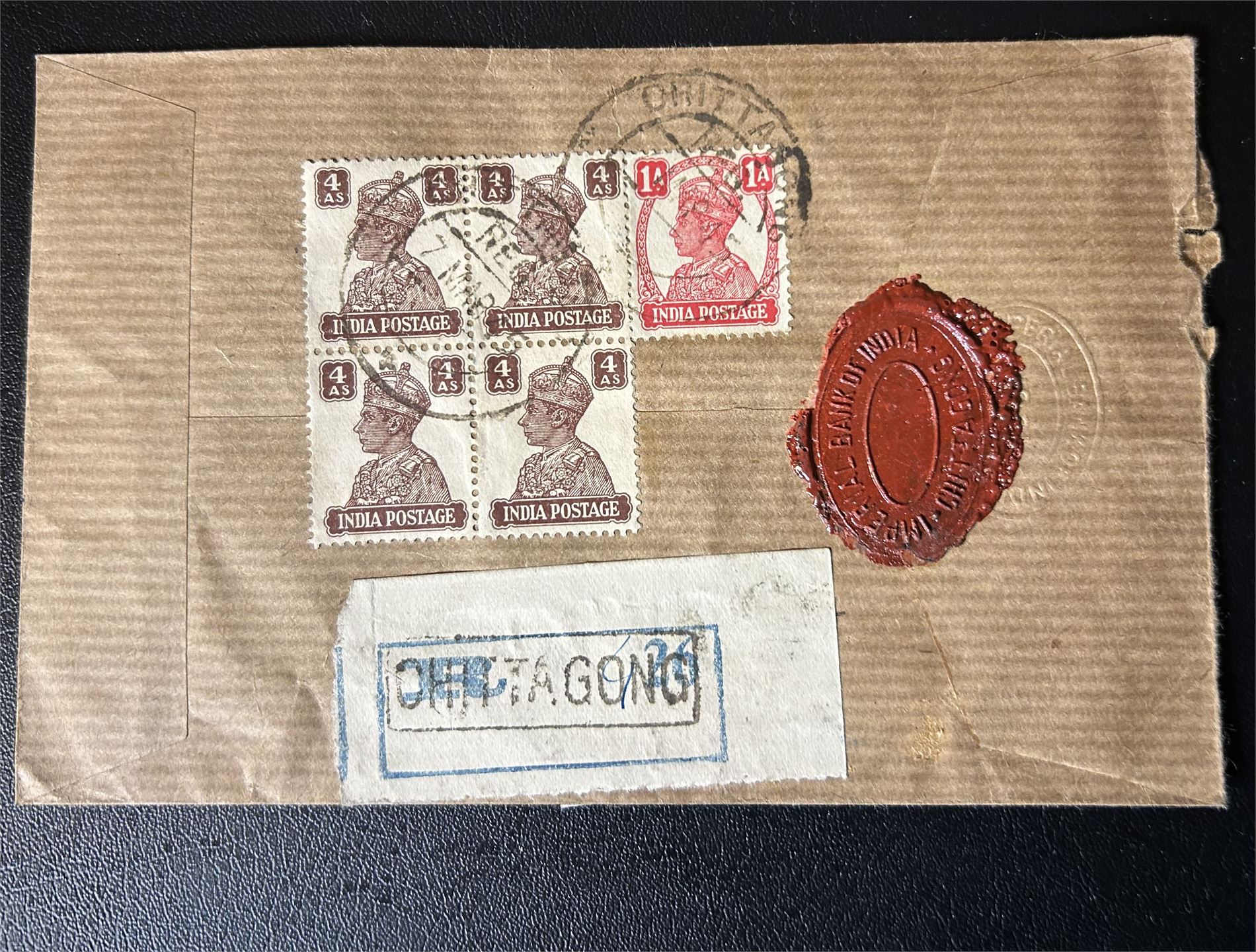 INDIA Brev til England stemplet "CHITTAGONG 7 MAR 45". Lakksegl "Imperial Bank of India"